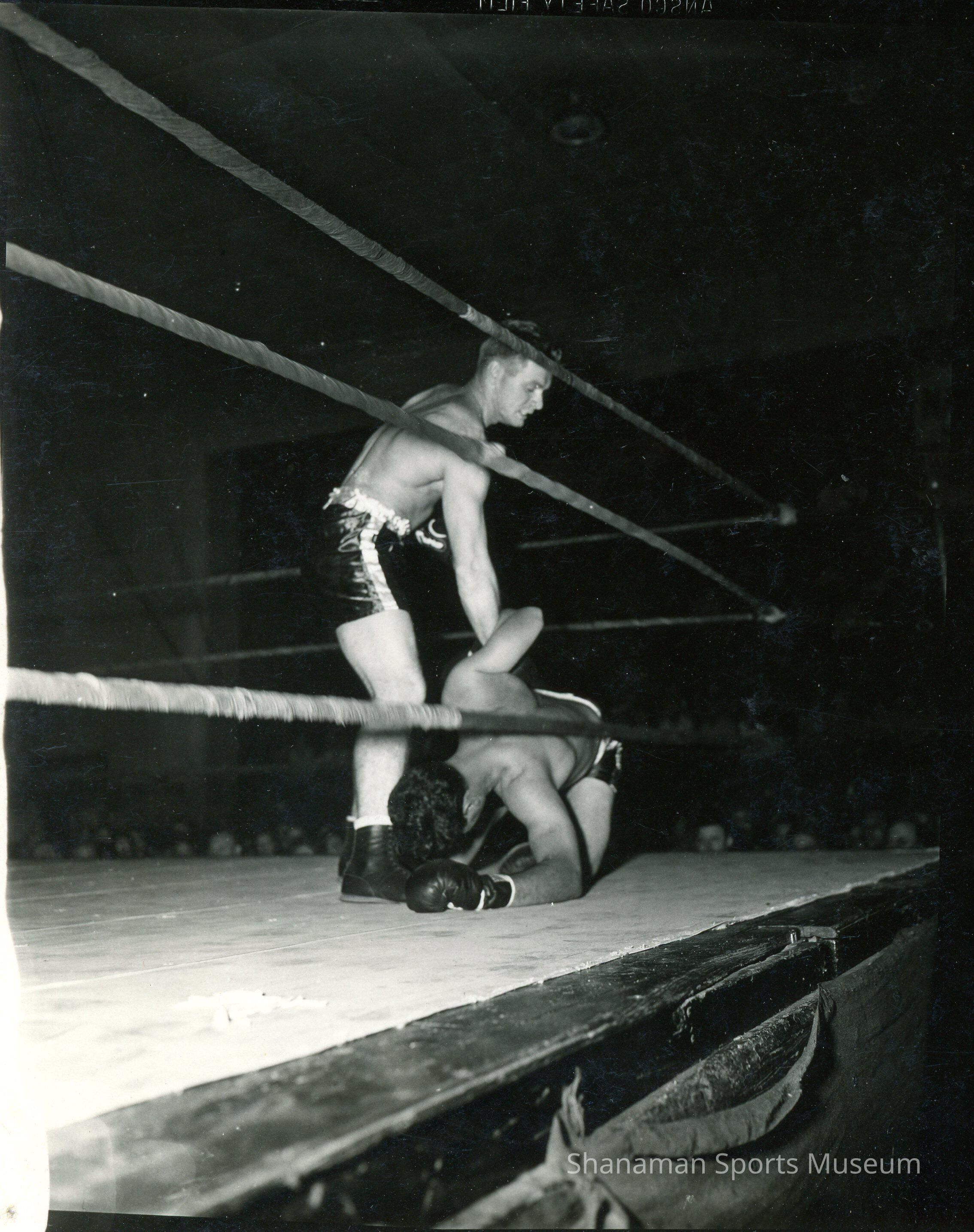 Photograph, b/w of boxing match between Bliss Croft and unknown opponent. Croft was a Tacoma native and was an accomplished boxer in the 1940s.Relationships