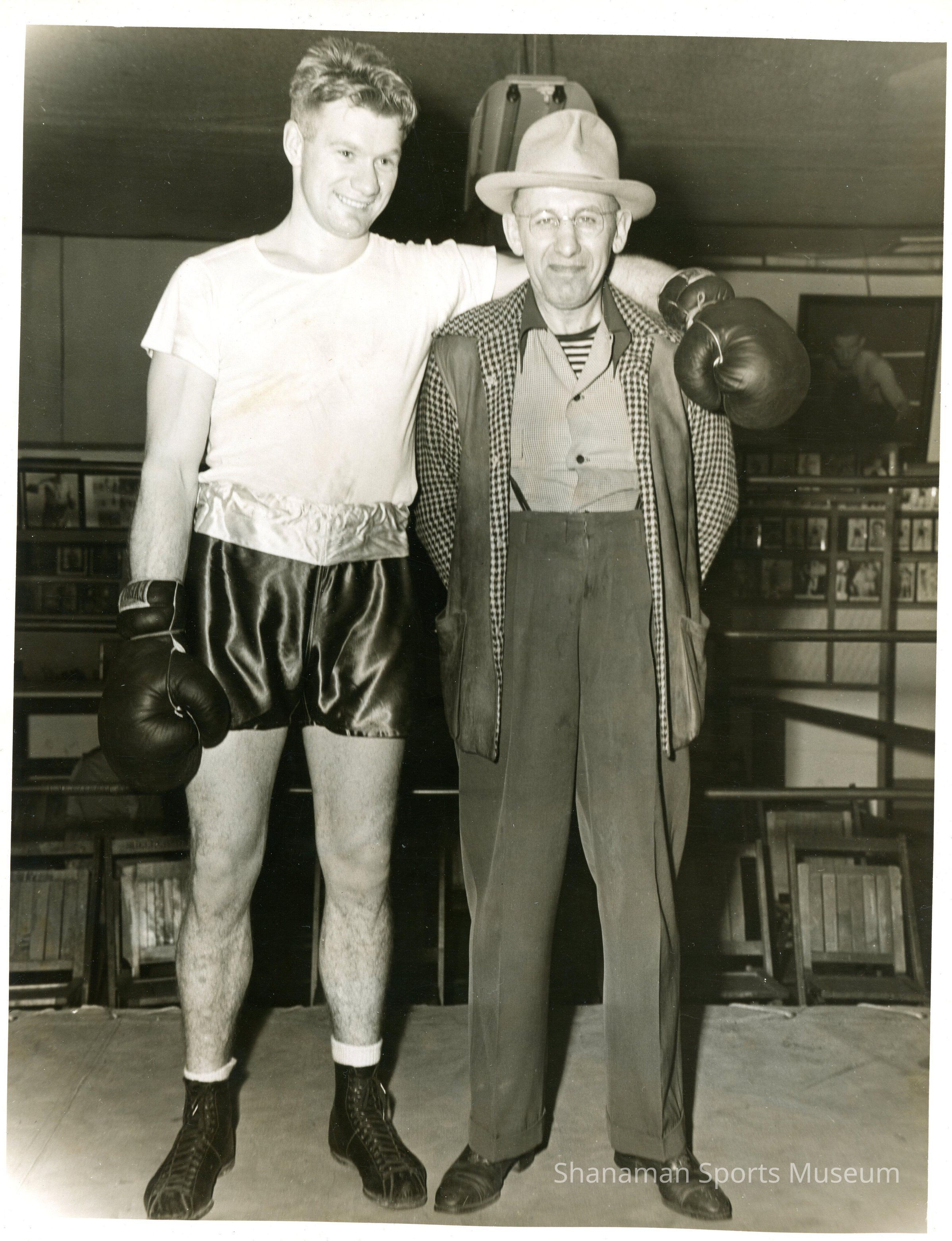 Photograph, b/w of Bliss Lee Croft (L) with his arm around over the shoulder of maybe his trainer. Bliss Croft was a Tacoma native and was an accomplished boxer in the 1940s.Relationships