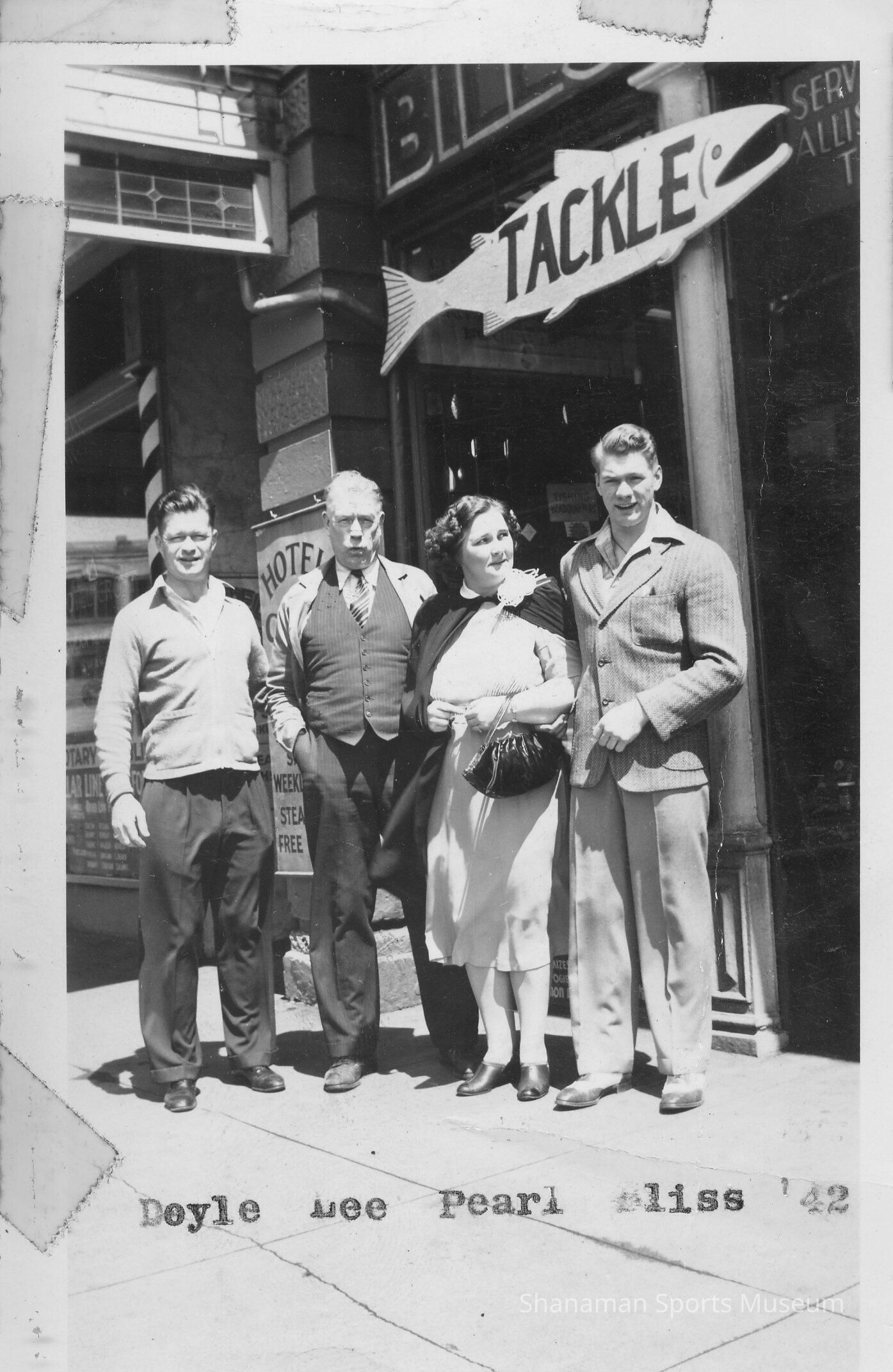 Photograph, b/w of the Croft Family in front of a tackle shop in 1942. Bliss Croft is on the right, next to his mother Pearl (center right), his father, HW Lee Croft (left center) and his brother, Doyle (far left). Croft was a Tacoma native and was an accomplished boxer in the 1940s and served in the air force during WWII.Relationships