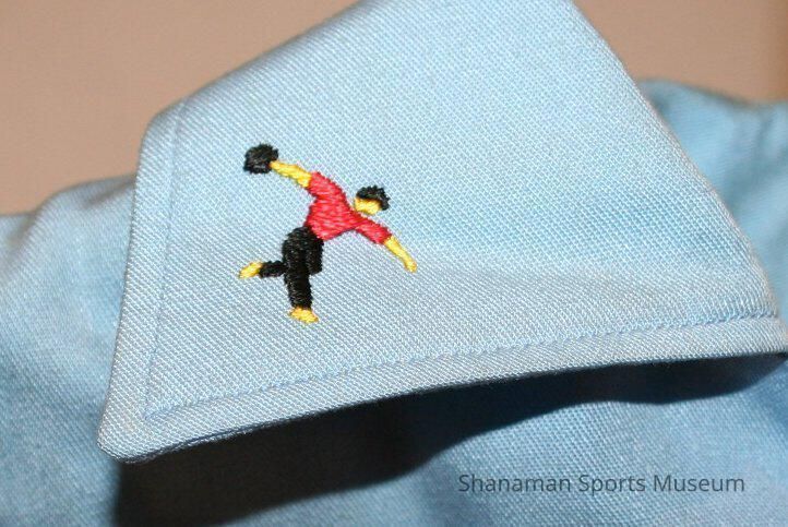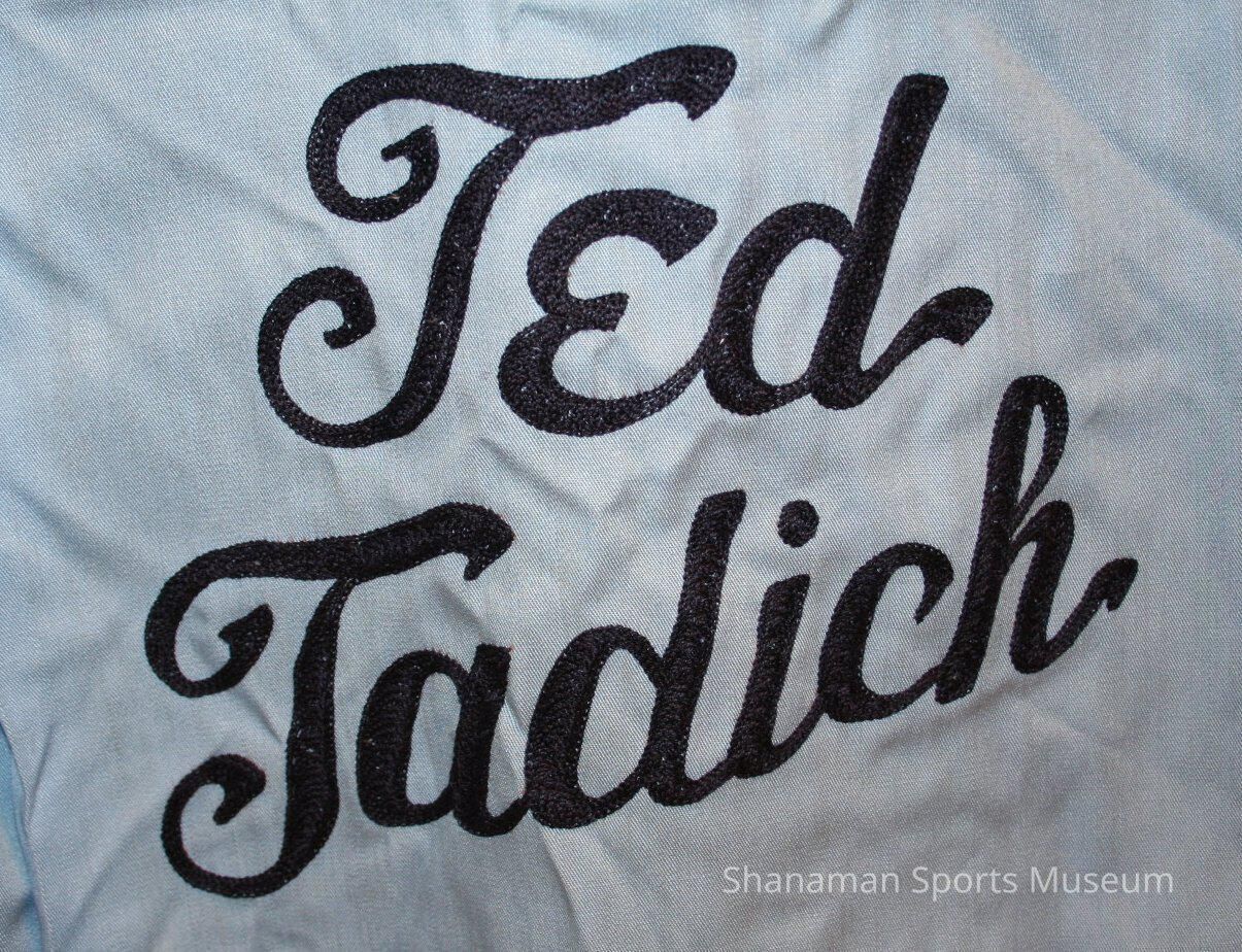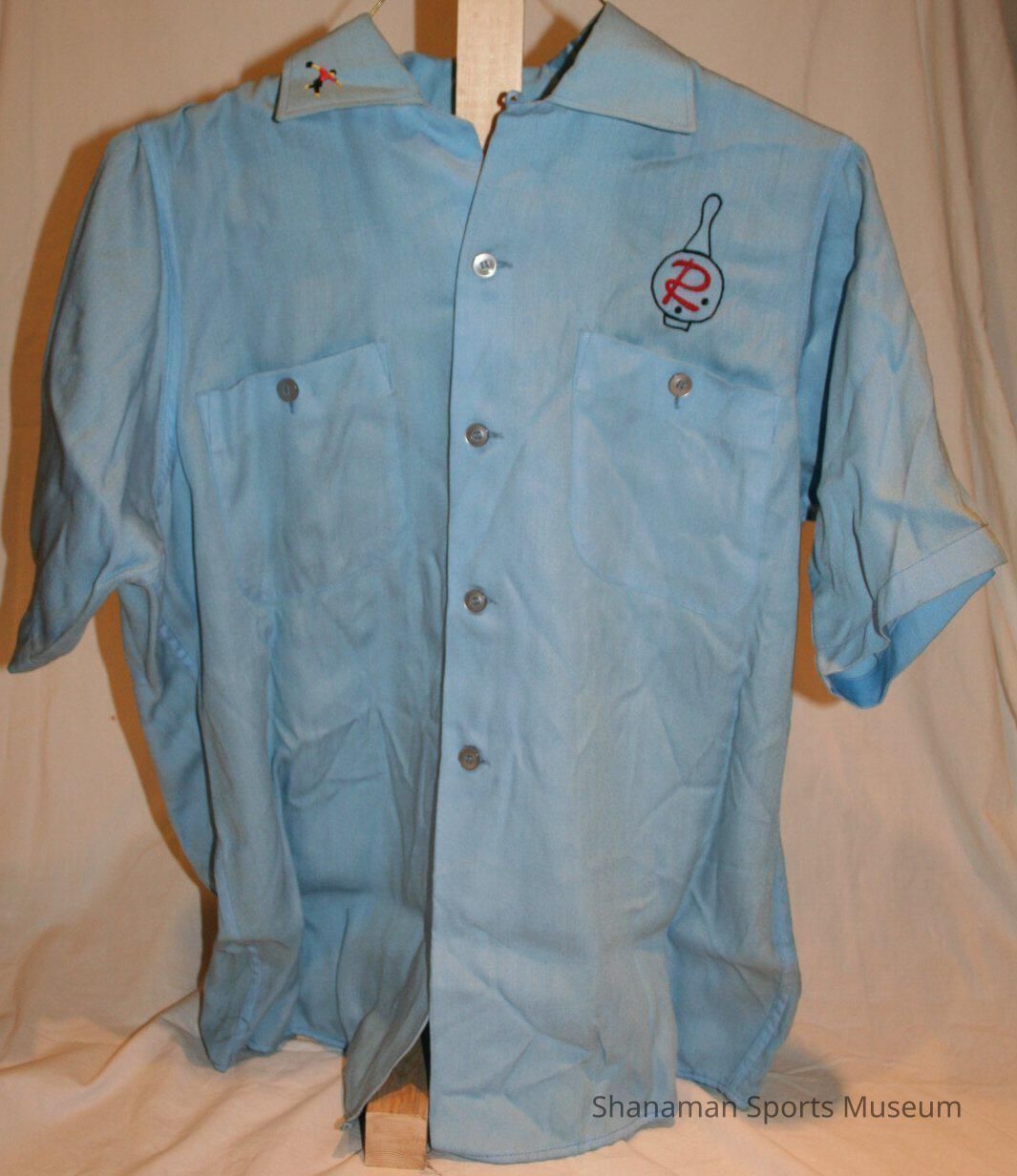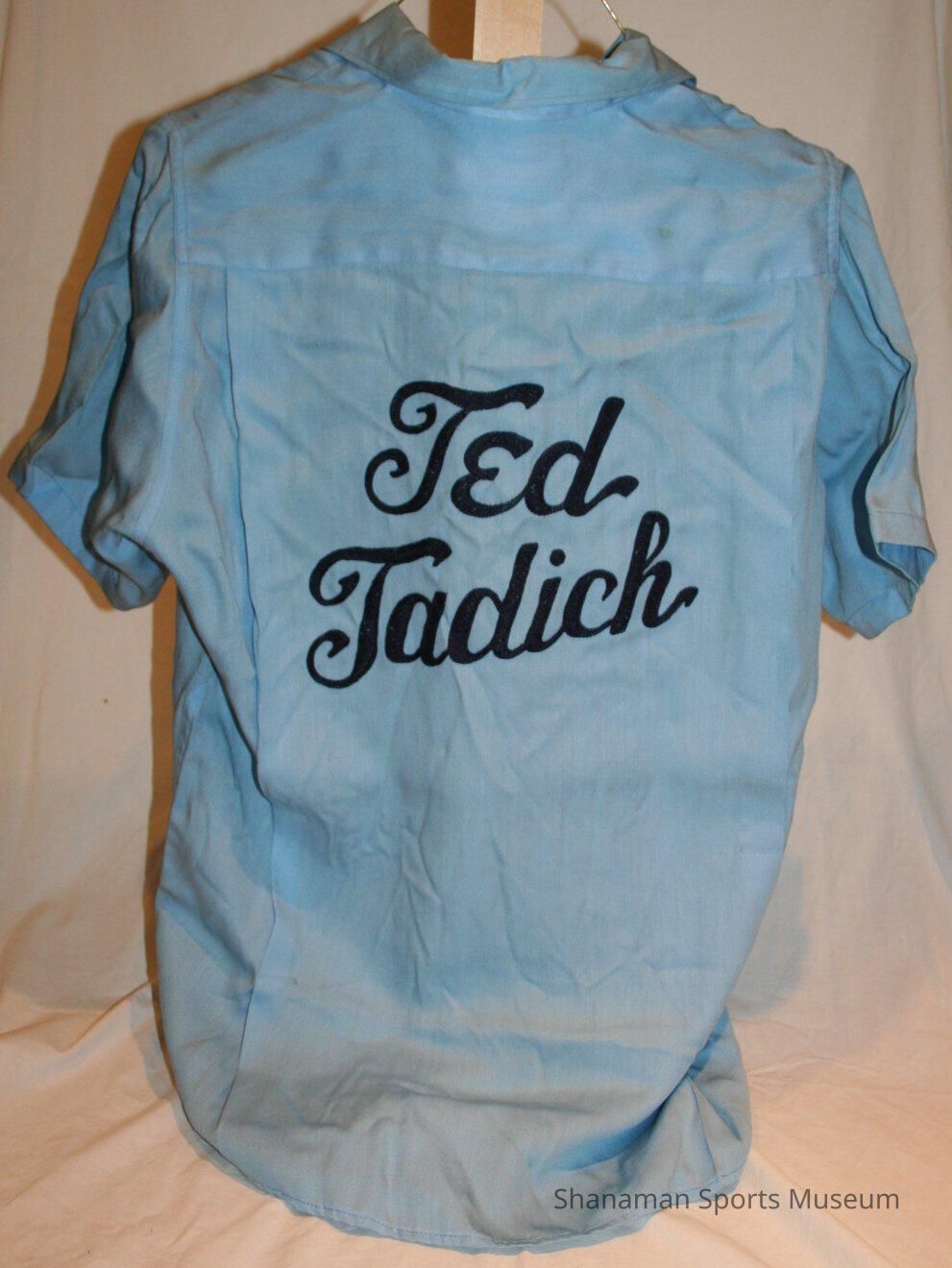 This blue bowling shirt, with an embroidered bowler and pin logo as well as the name of Ted Tadich stitched on it, is a piece of memorabilia provided by Tadich. Andrew Joseph “Ted” Tadich was a Tacoma native who was inducted into the Tacoma-Pierce County Sports Hall of Fame in 1962.