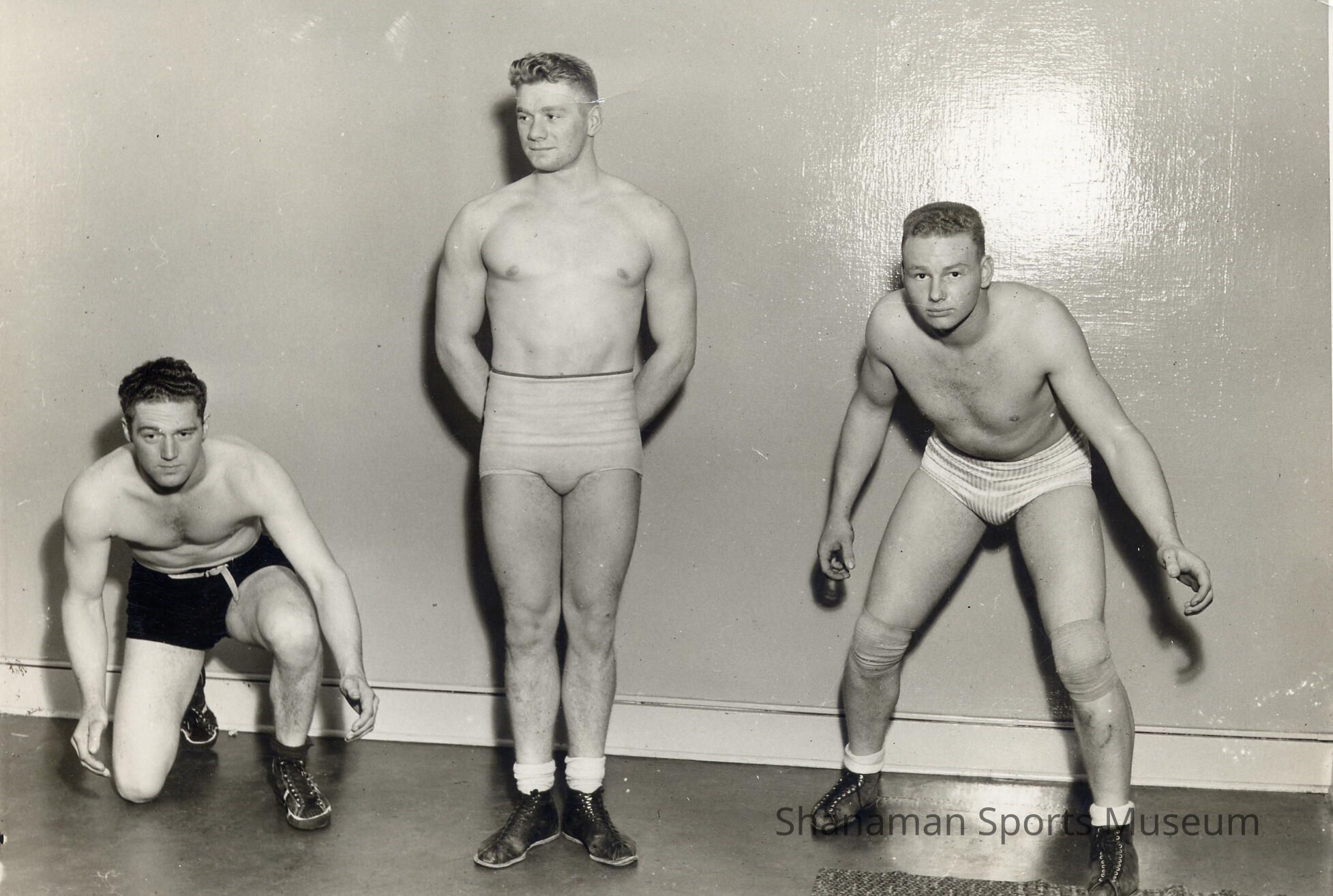 Photograph, b/w of Bliss Croft (Center) and Hugo Swanson (R) with another wrestler posing for wrestling. Swanson and Croft played football at Pacific Lutheran College together before joining the air force during WWII. Croft became an accomplished boxer in the 1940s.Relationships