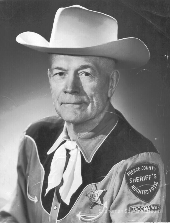 Photograph, b/w portrait of Sheriff WH Lee Croft wearing a cowboy hat, badge and Sheriff Mounted Pose shirt in 1942. HW Croft was a long-time Pierce County Sheriff and father of Tacoma boxer Bliss Croft and also boxed himself.Relationships