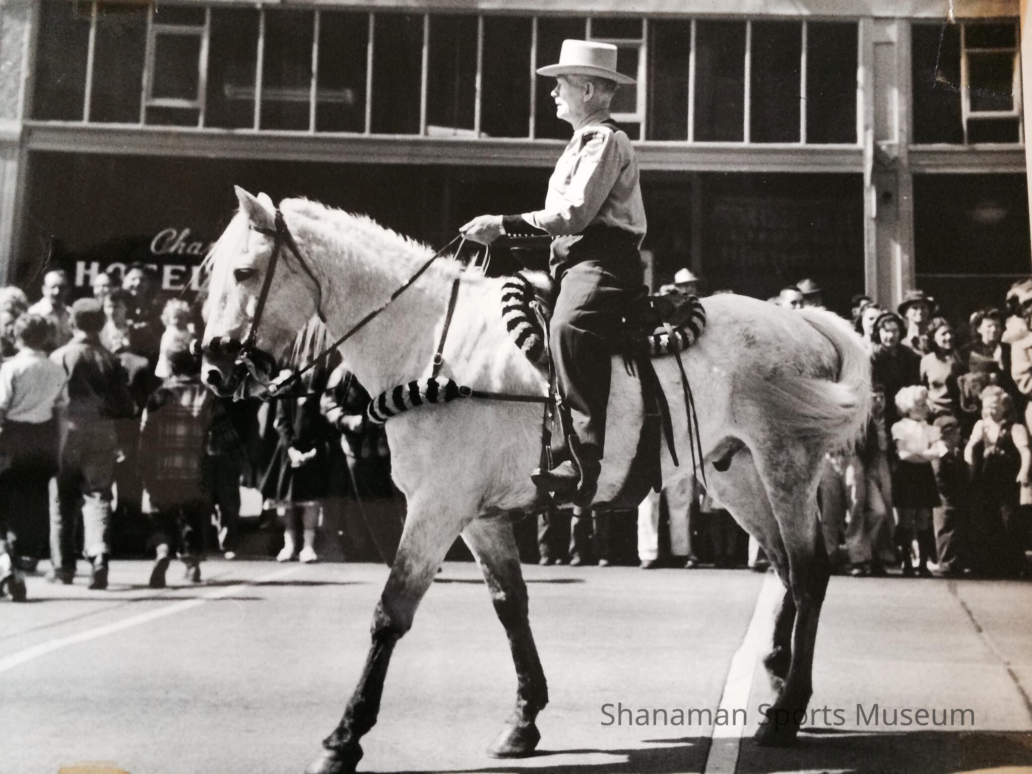 Photograph, b/w Sheriff WH Lee Croft on horseback in a parade c. 1940s. HW Croft was a long-time Pierce County Sheriff and father of Tacoma boxer Bliss Croft and also boxed himself.Relationships