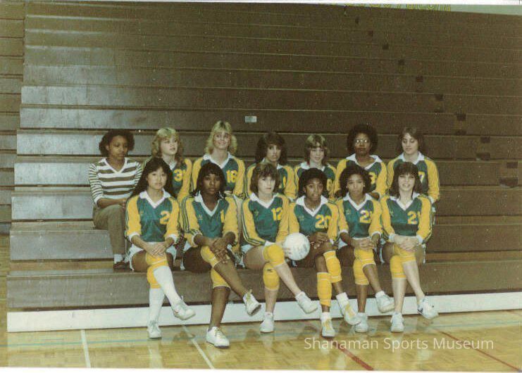 photograph, color, members of the Foss High School womens volleyball team sitting on the bleachers in green shirts, c. 1980s. Angie Eichholtz was the team coach.Relationships