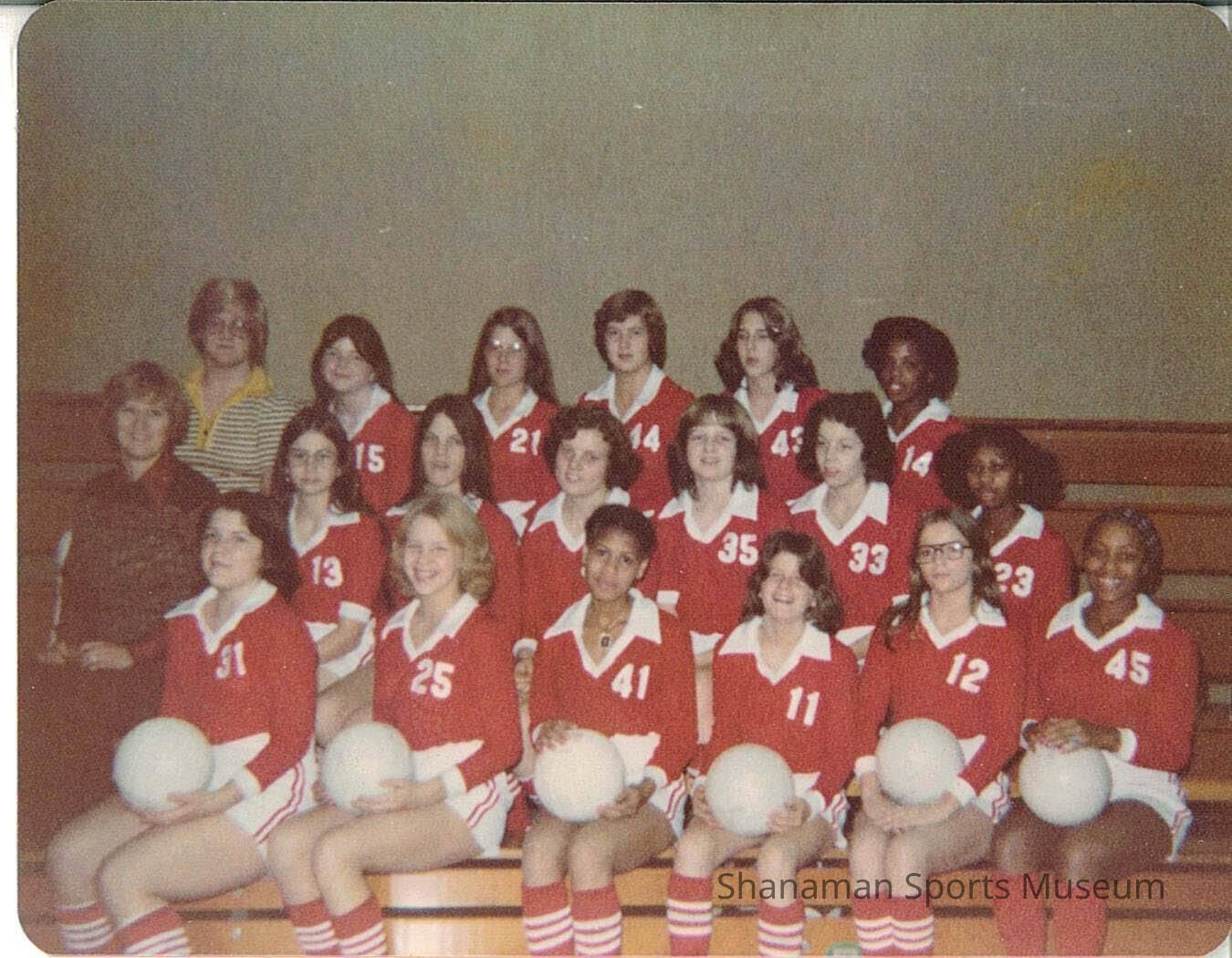 photograph, color, members of the Jason Lee MIddle School womens volleyball team sitting on the bleachers in red shirts, c. 1970s. Angie Eichholtz was the team coach (in black sweater), other coach was Coach Holm.Relationships