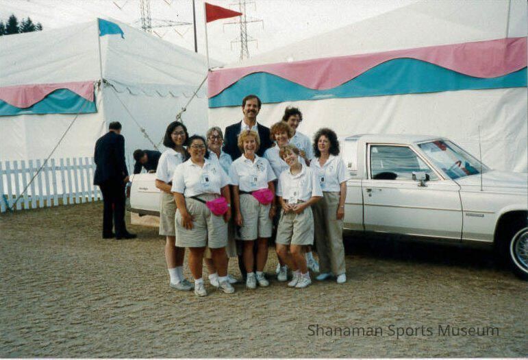 photograph, color, 1990 Goodwill Games Press Crew. Angie Eichholtz is center with pink pouch.Relationships