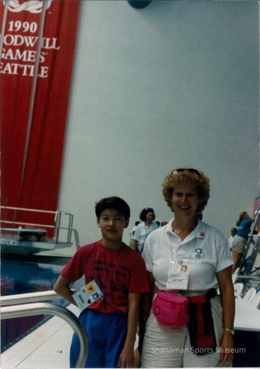 photograph, color, Angie Eichholtz, right, assisting a swimmer at the 1990 Goodwill Games.Relationships