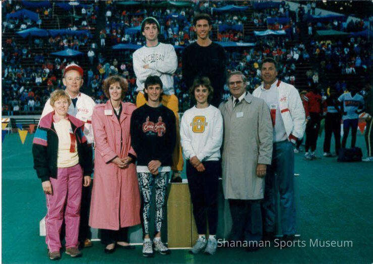 photograph, color, at a 1980s Star Track competition. Angie Eichholtz is front left, with Dan Inveen, Bud Hatley, 2 WIAA representatives and 4 high school track athletes.Lexicon