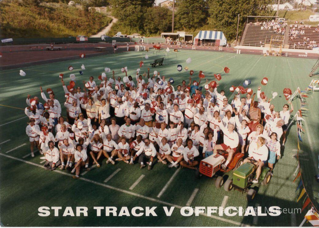photograph, color, 1986 Star Track officials on the field tossing hats in the air. Angie Eichholtz was the meet's co-director along with Bud Hatley.Lexicon