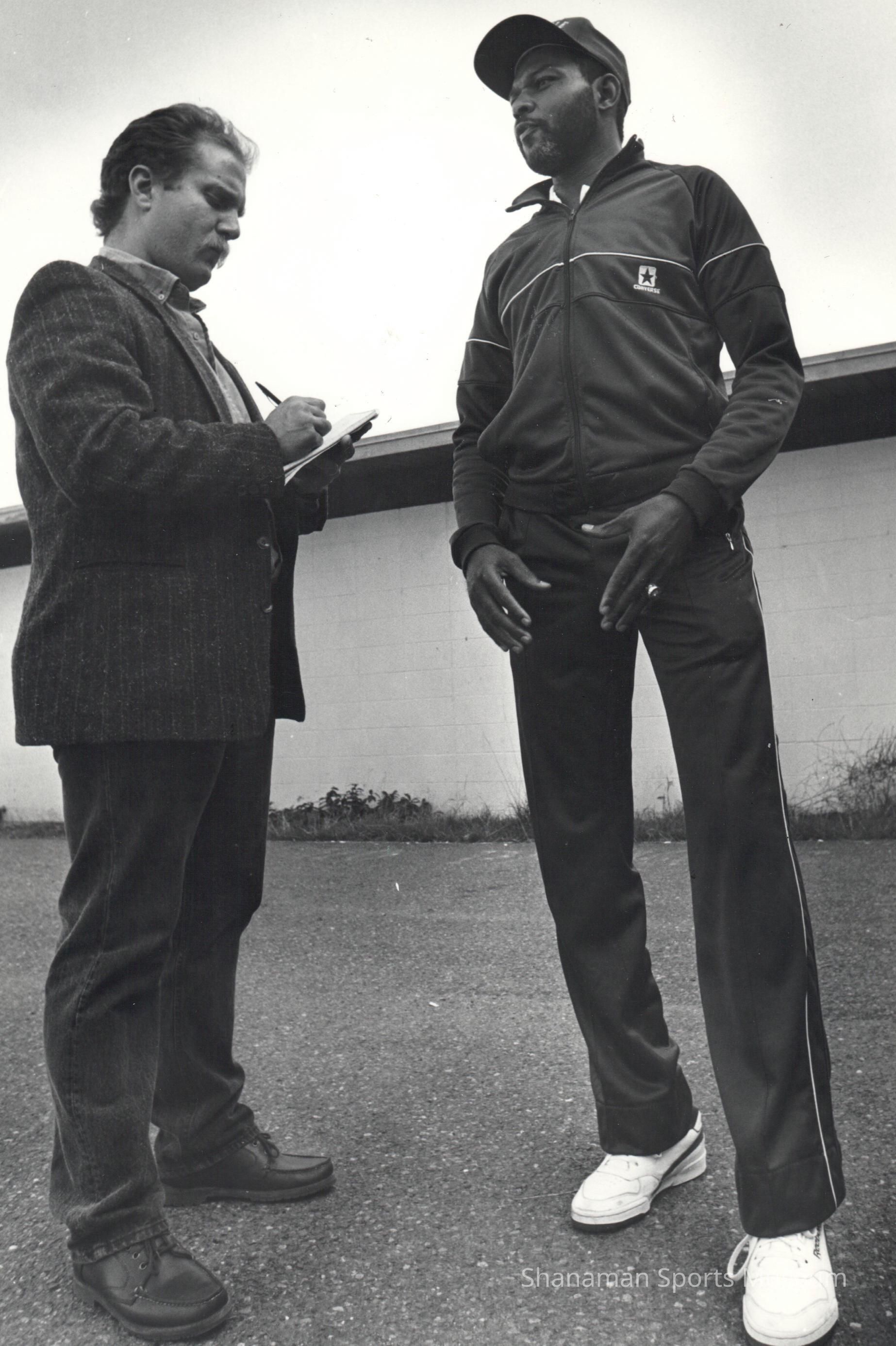 Photograph- Michael Kahn (L) interviewing an athlete. Michael Kahn (June 5, 1954 - December 17, 2008) was a sports journalist, best known for his contributions, via what is now CBS Sportsline, to the beginnings of internet sports journalism.