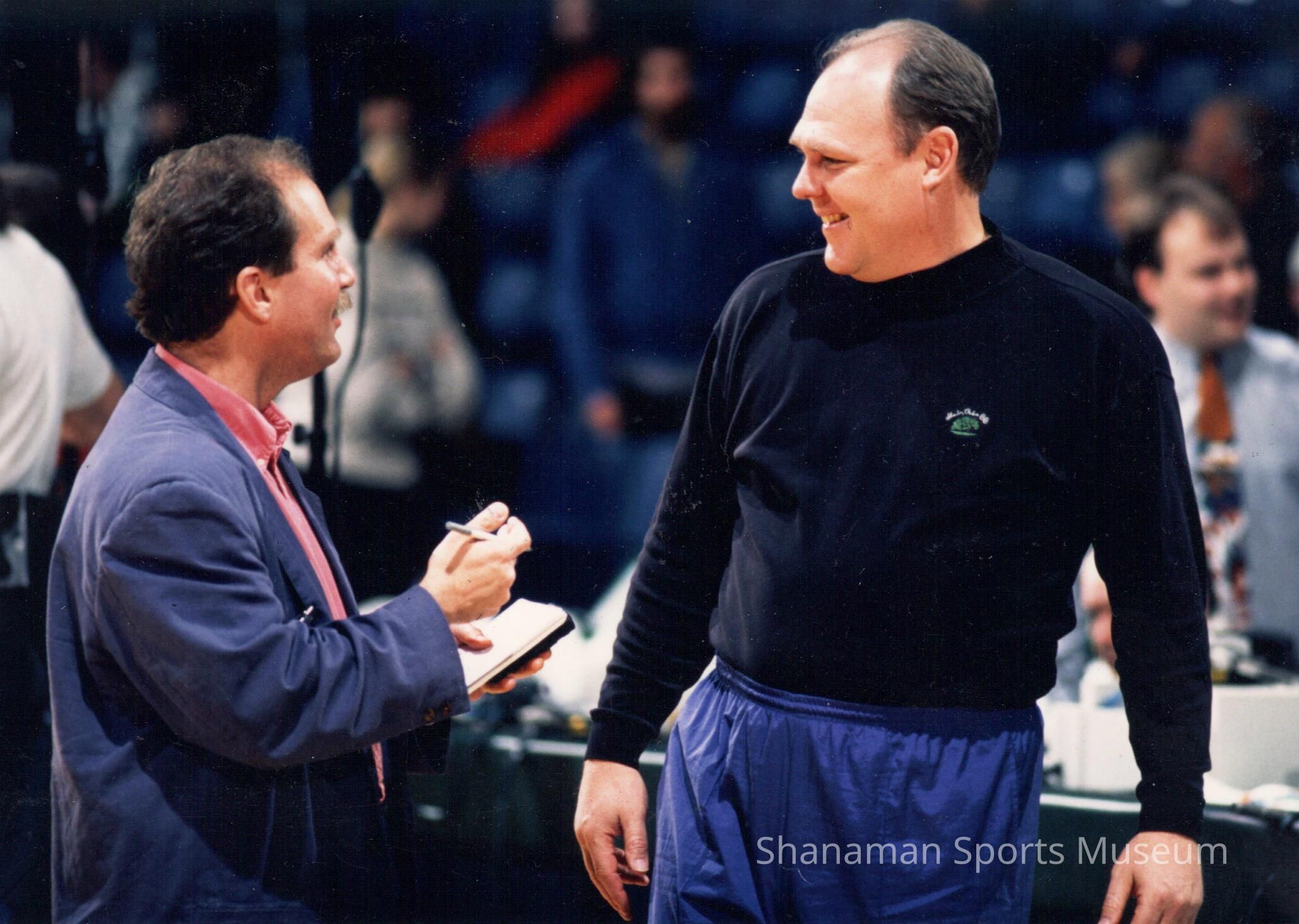 Photograph- Michael Kahn (L) interviewing George Carl (R), Seattle Sonics coach. Michael Kahn (June 5, 1954 - December 17, 2008) was a sports journalist, best known for his contributions, via what is now CBS Sportsline, to the beginnings of internet sports journalism.