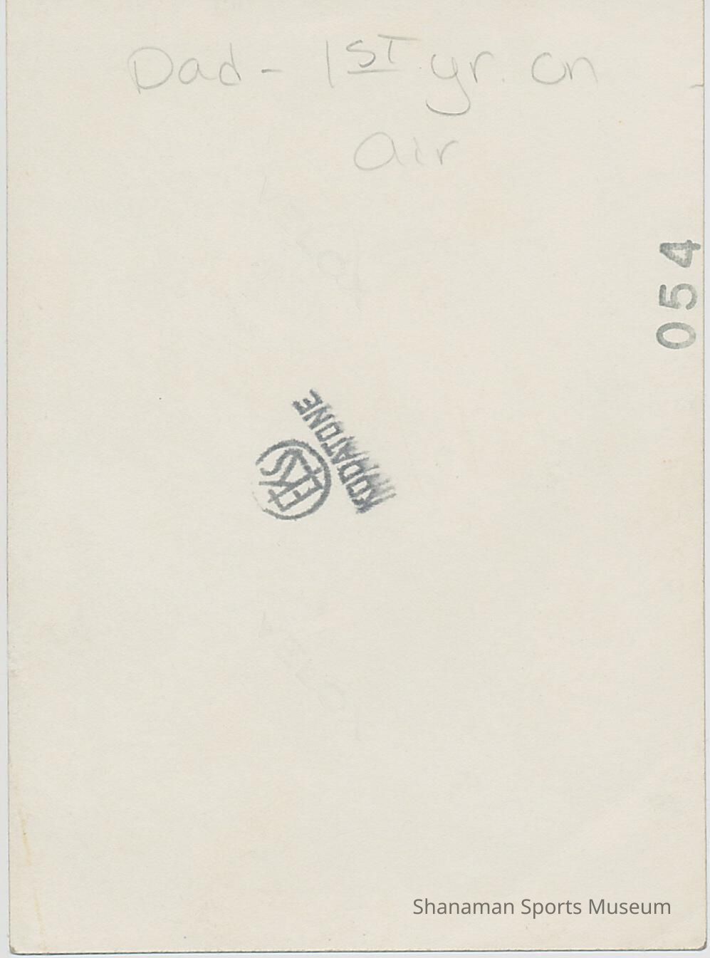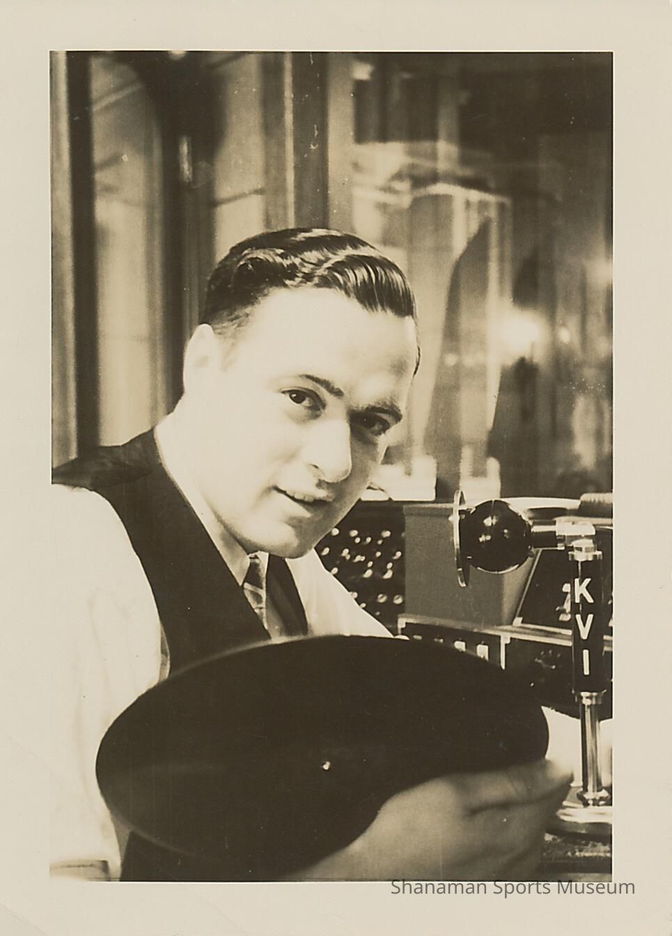 B&W photo of Jerry Geehan in radio studio holding vinyl record and looking at the camera (text on back of photo says "Dad - 1st yr on air")