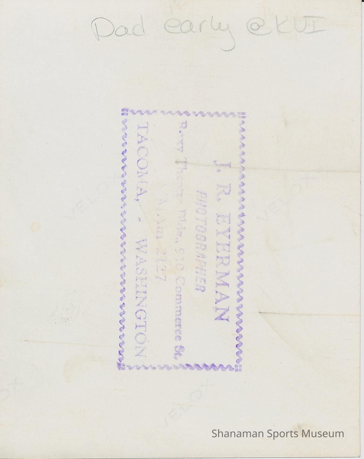 B&W photo of Jerry Geehan standing in front of a microphone, reading from a piece of paper (written on back "Dad - early @ KUI")