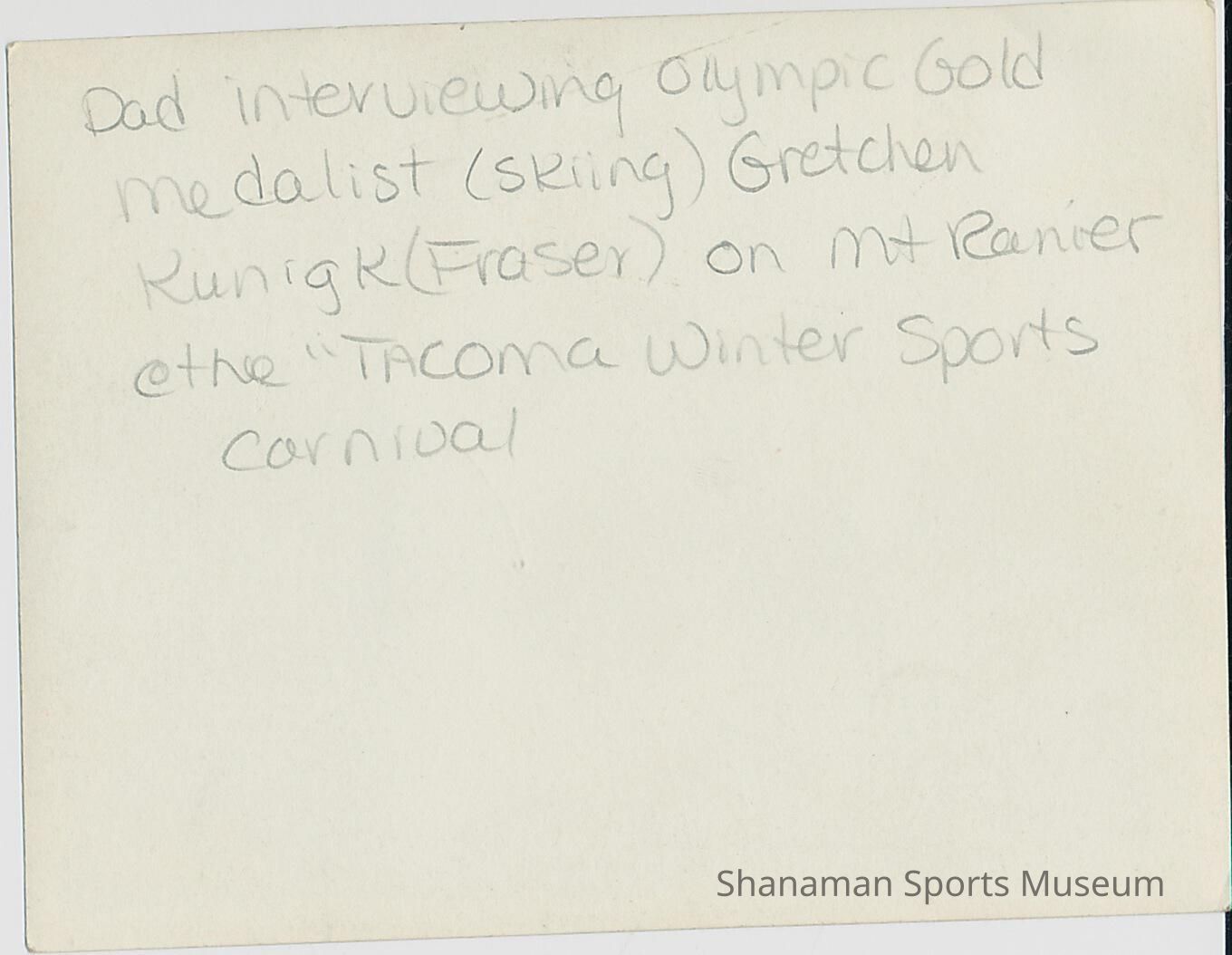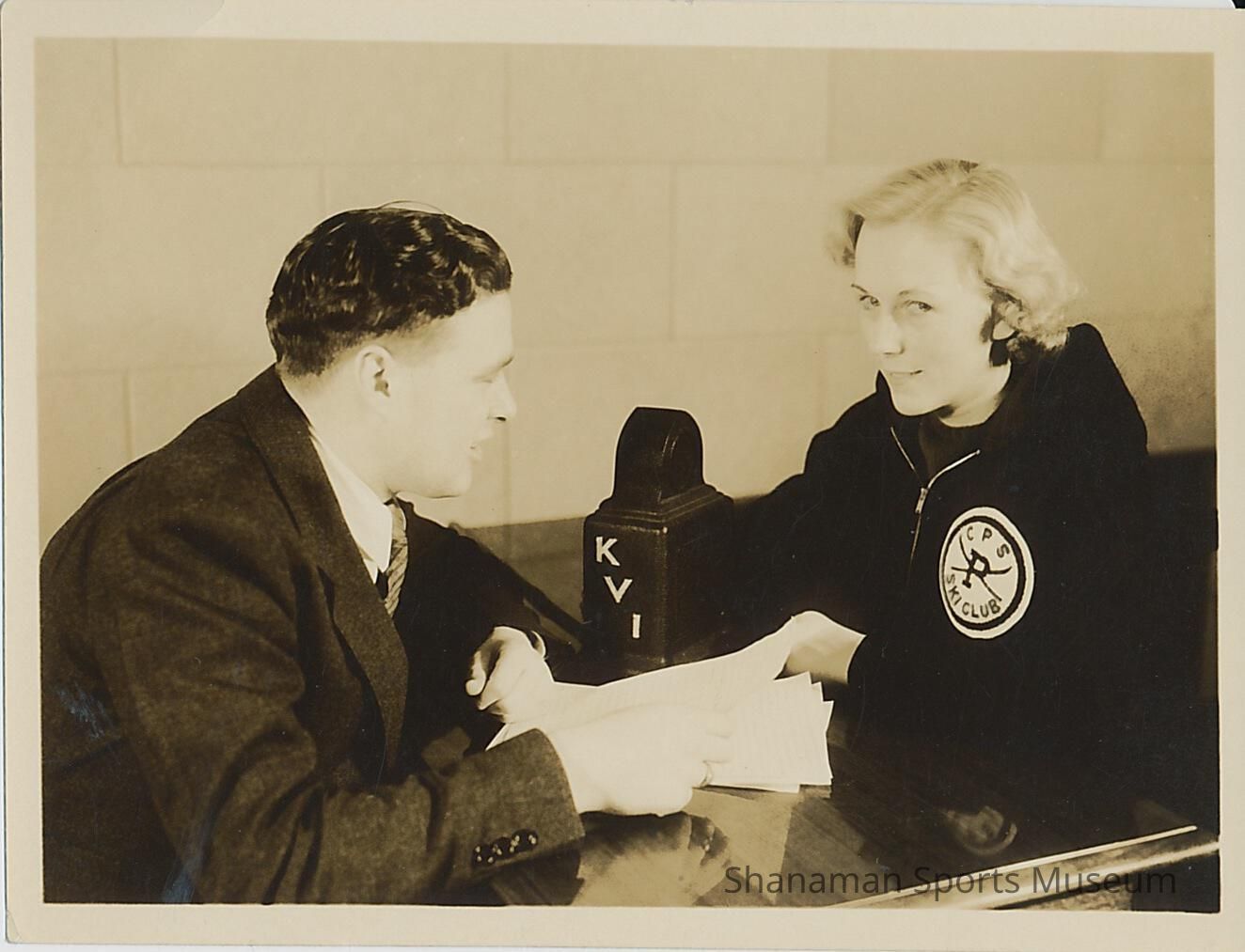B&W photo of Jerry Geehan interviewing a blonde woman (Gretchin Kunigk) inside at a desk (written on back "Dad interviewing Olympic Gold medalist (skiing) Gretchin Kunigk (Fraser) on Mt. Rainier @ "The Tacoma Winter Sports Carnival")