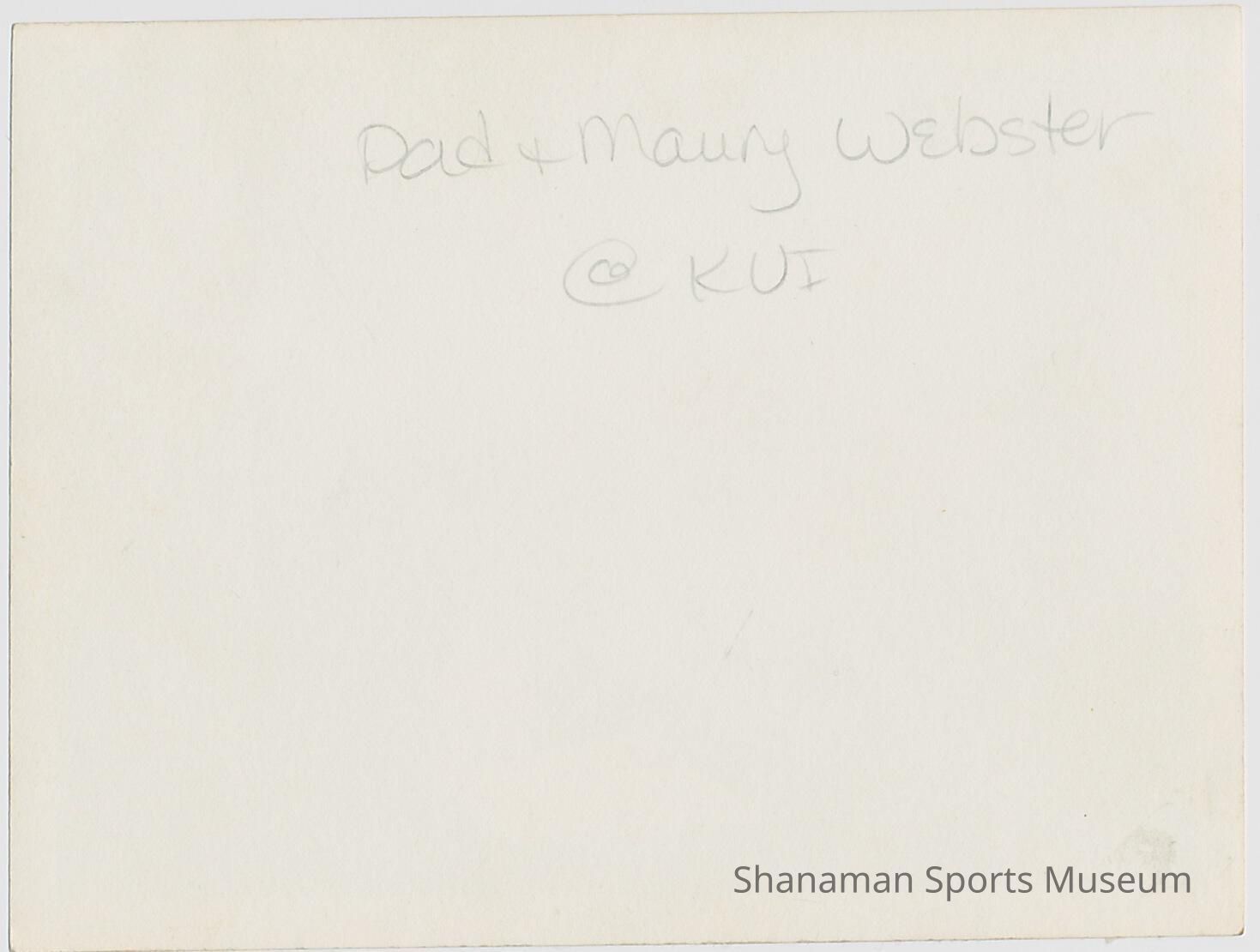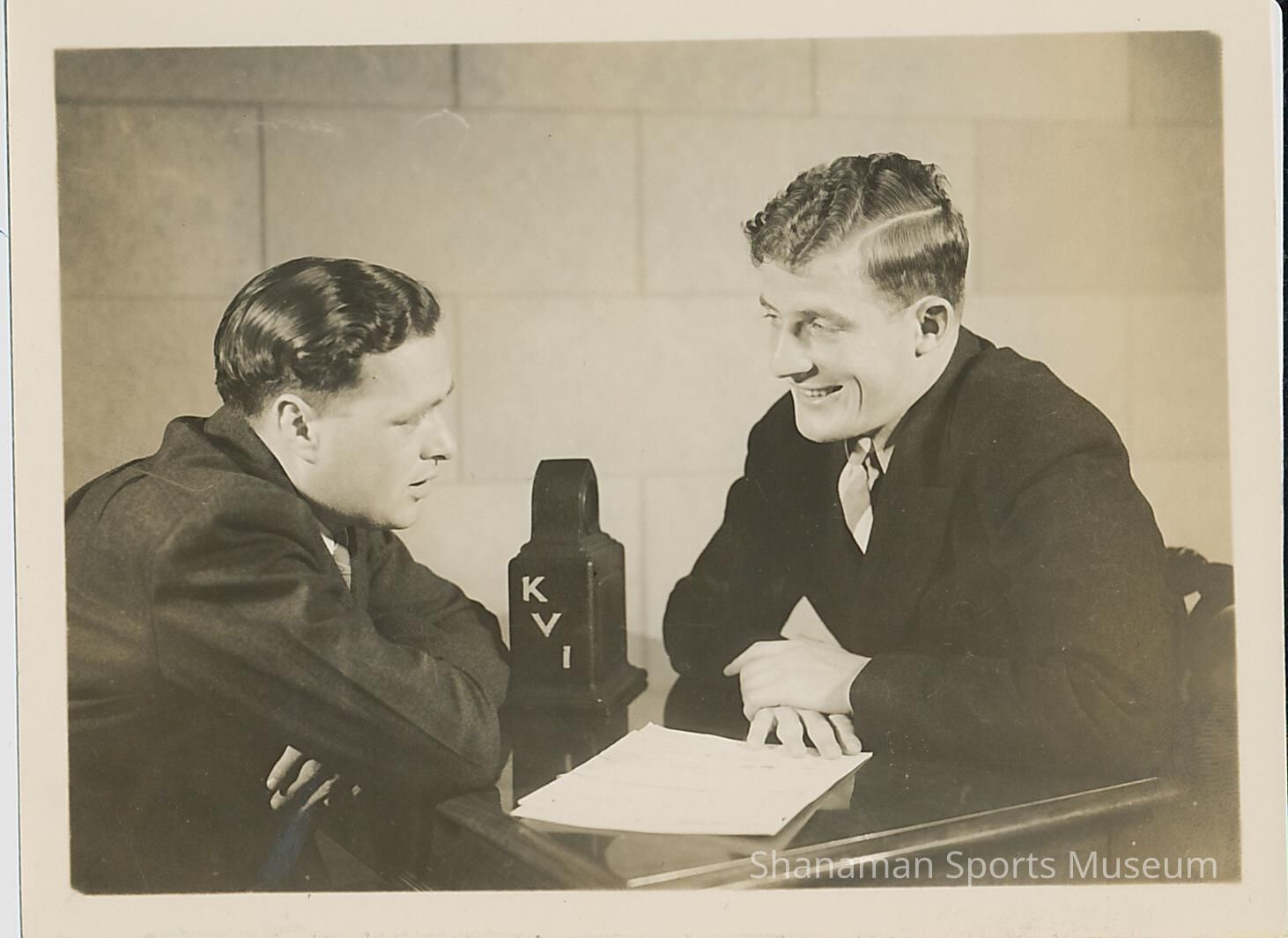 B&W photo of 2 men at during an interview; Jerry Geehan possibly interviewing Maury Webster (written on back "Dad + Maury Webster @ KUI")