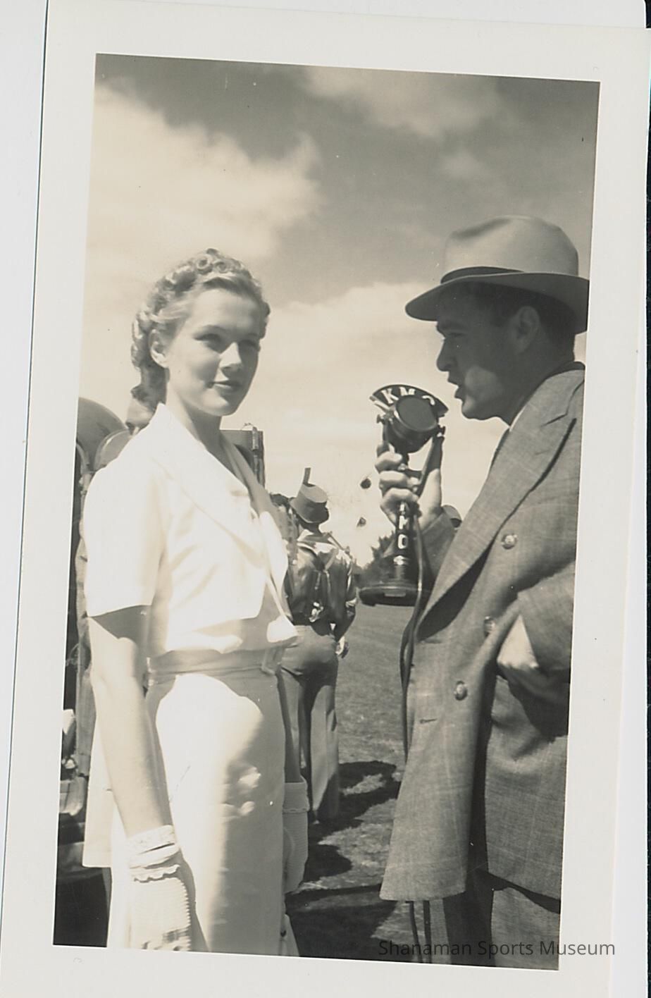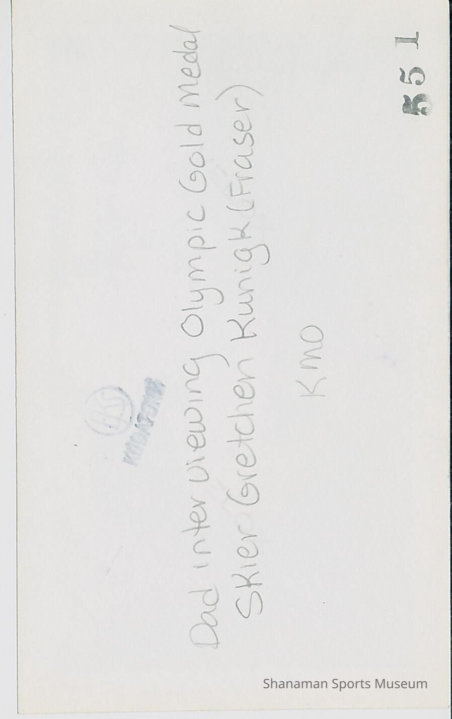 B&W photo of Jerry Geehan interviewing Gretchin Kunigk outside (written on back "Dad Interviewing Olympic Gold Medal Skier Gretchen Kunigk (Fraser) KMO")
