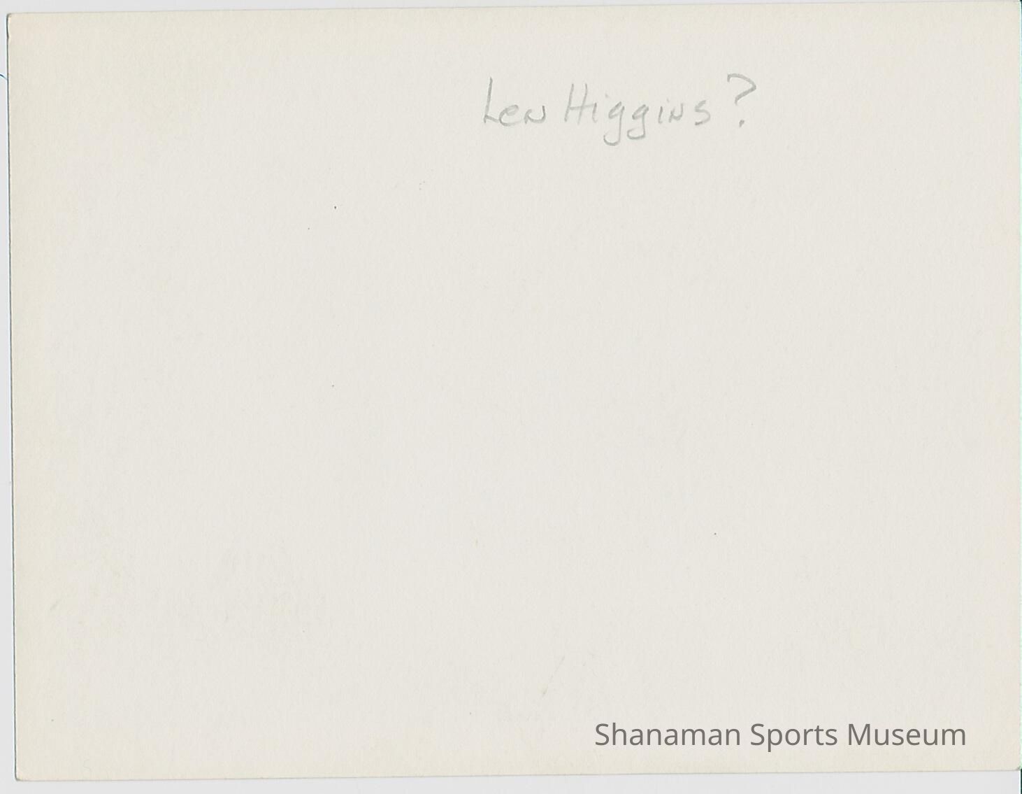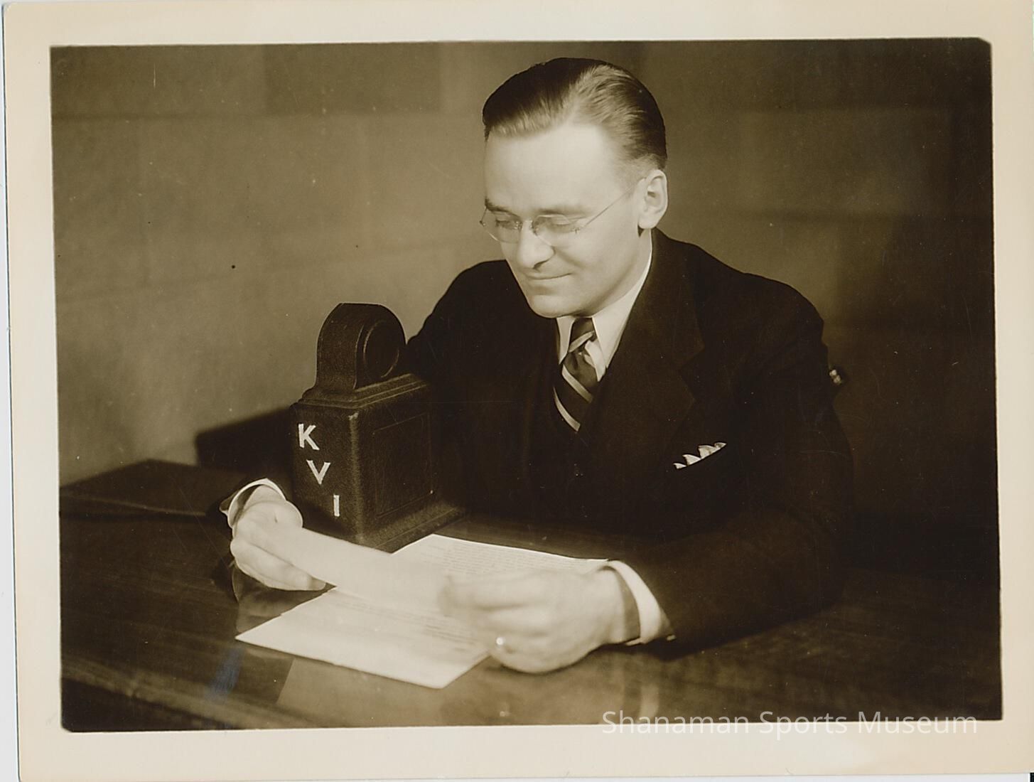 B&W photo of man at table with microphone, reading off piece of paper (written on back "Len Higgins?")
