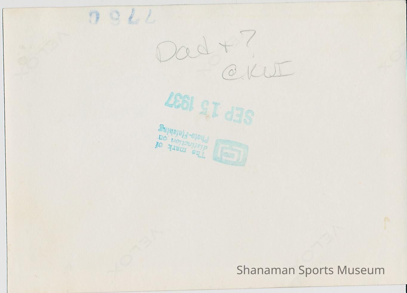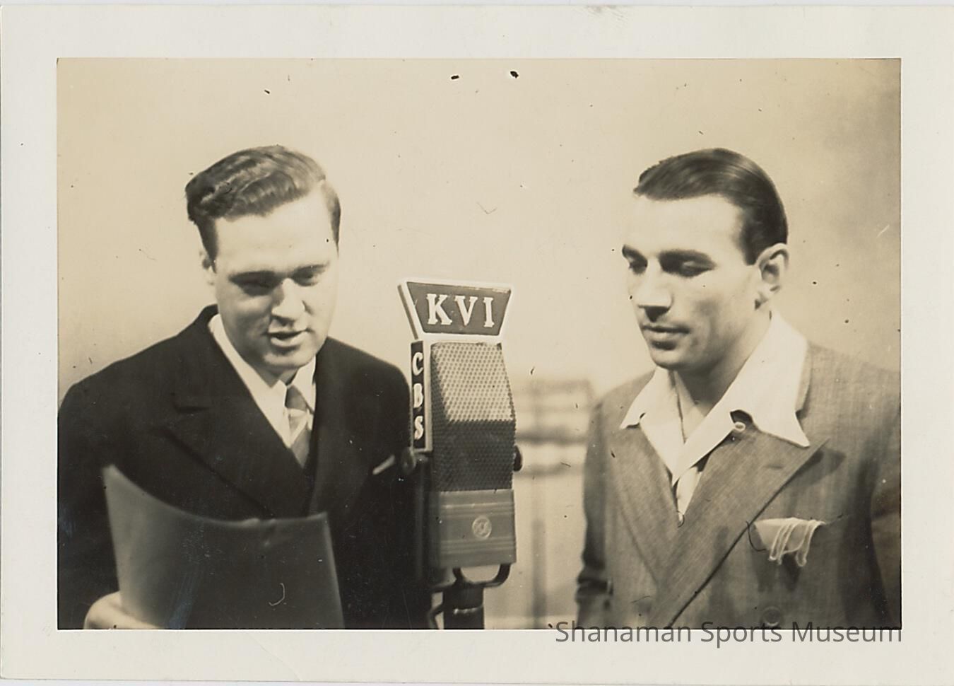 B&W photo of Jerry Geehan holding a piece paper interviewing unidentified man; outside setting (written on back "Dad +? @ KUI")