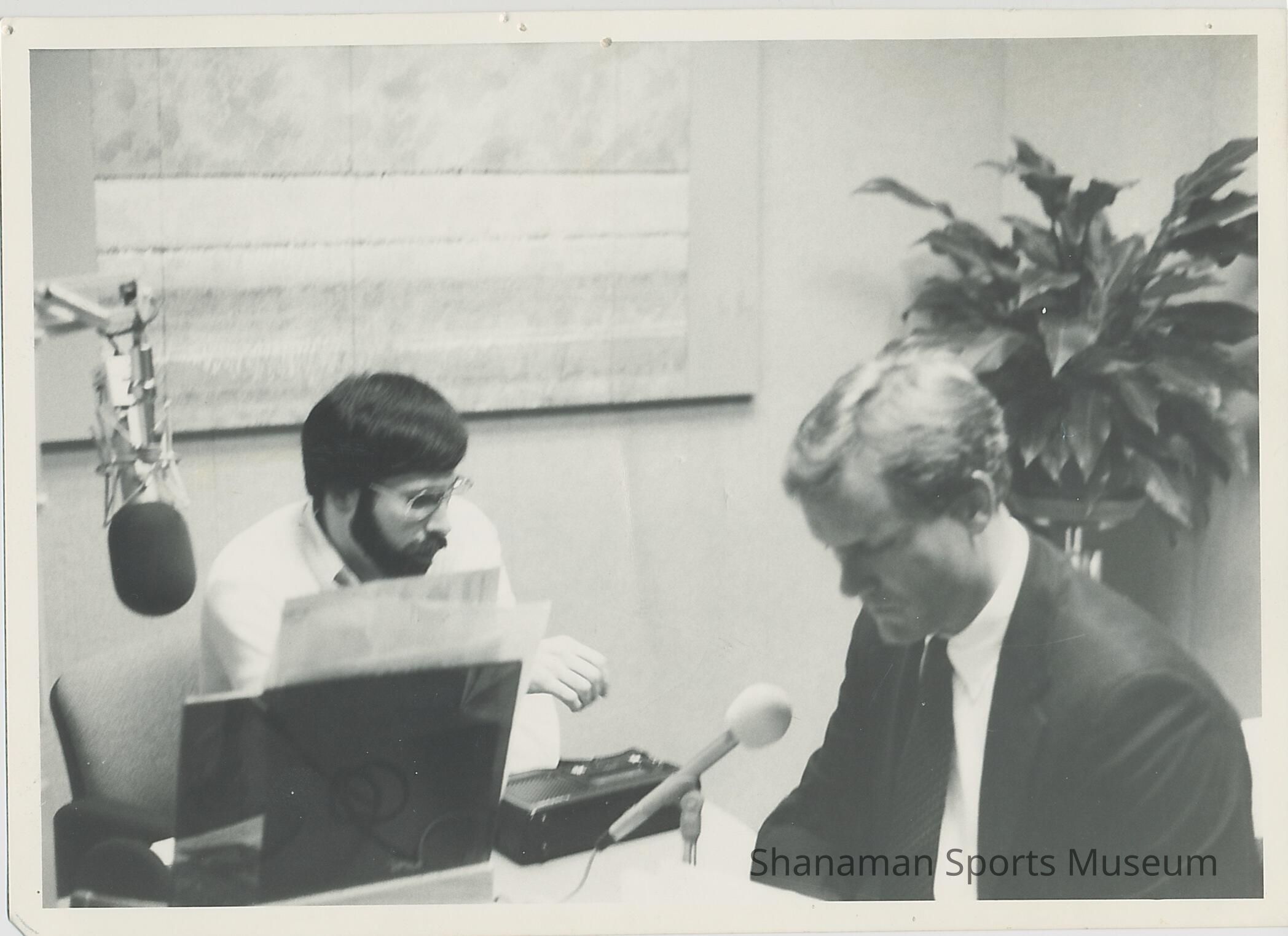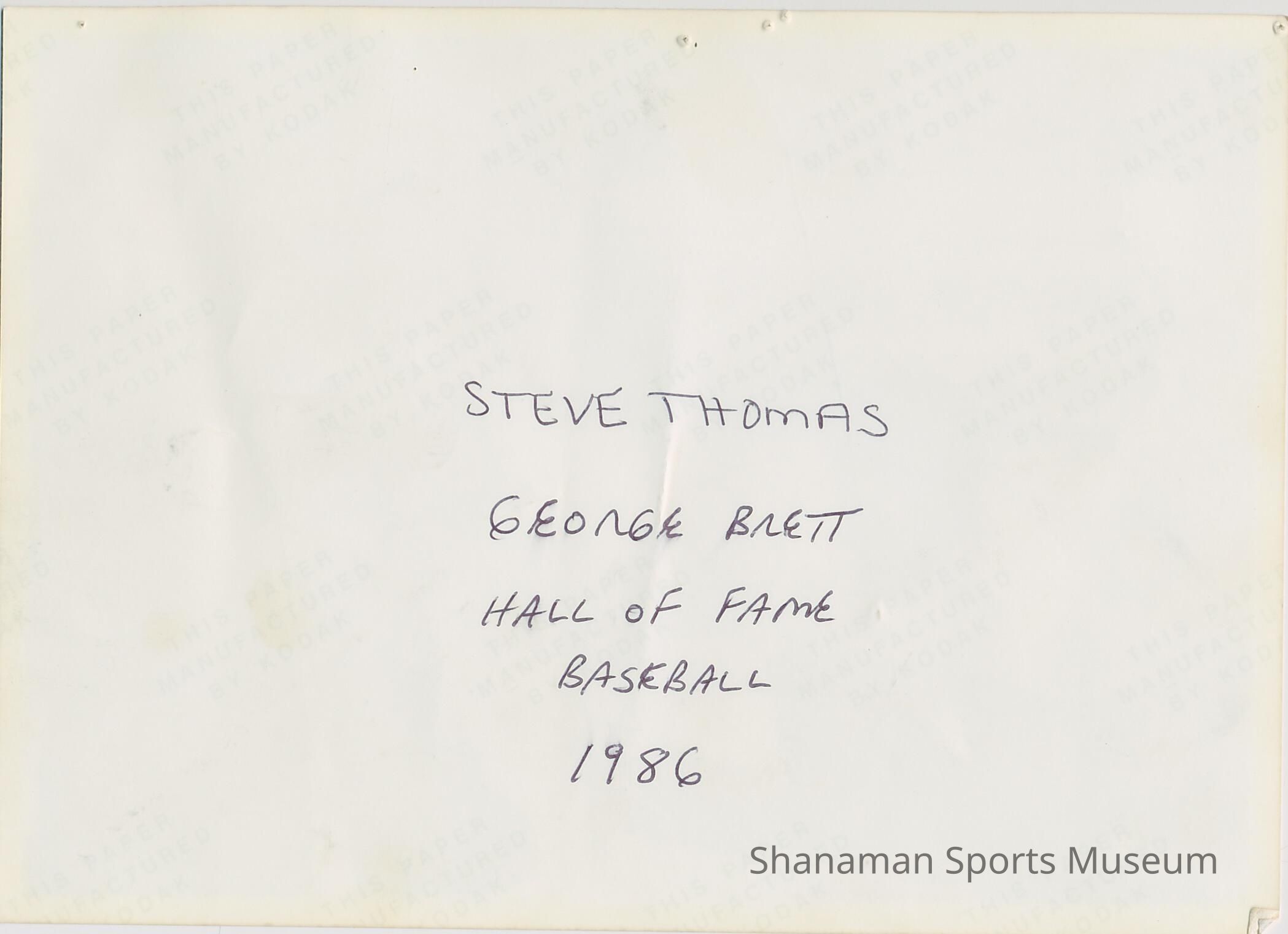 B&W Photo of Steve Thomas and George Brett inside ecording studio, c. 1986 (written on back "Steve Thomas, George Brett, Hall of Fame Baseball 1986")