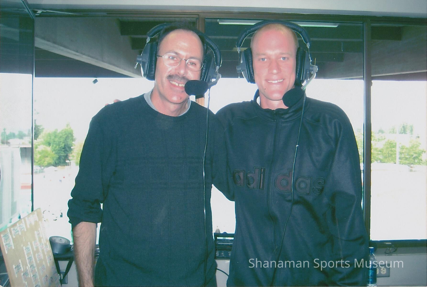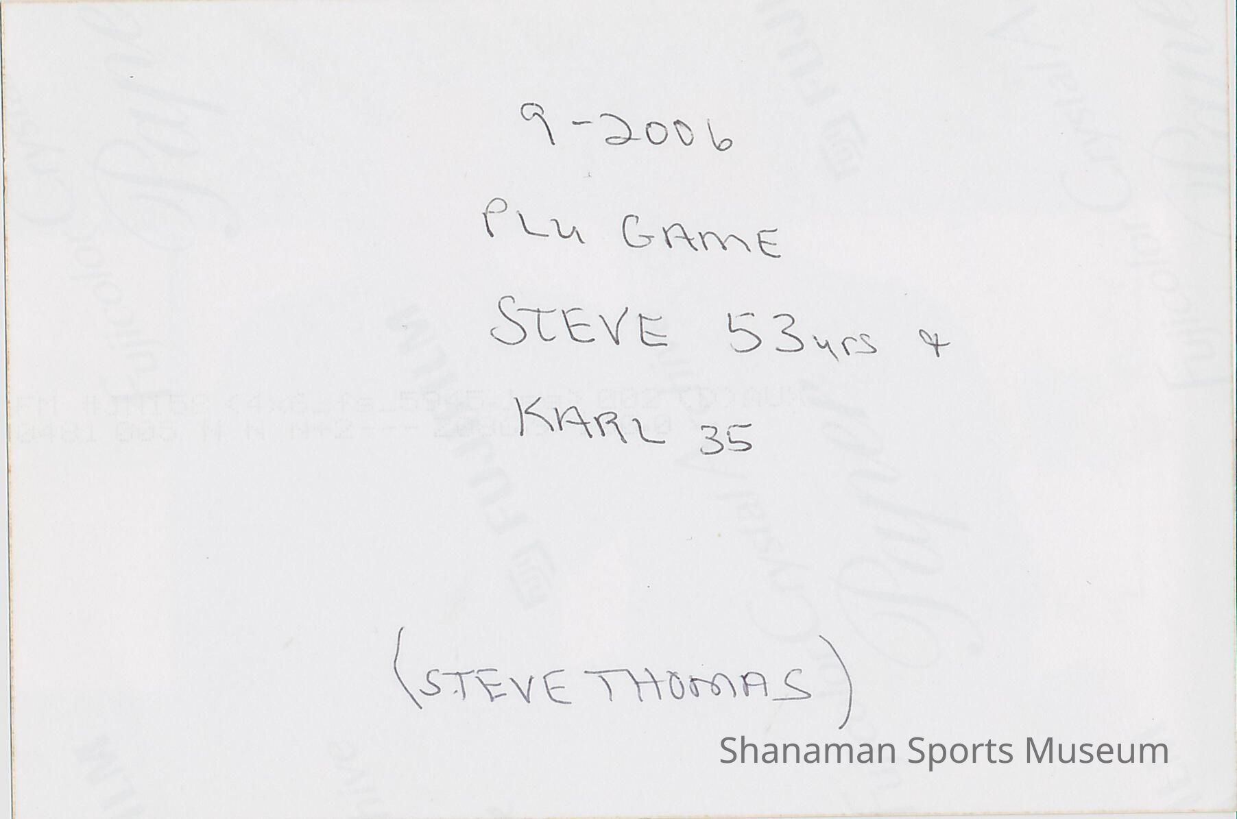 Color photo of two men with headsets (written on back "9-2006 PLU Game Steve 53 yrs + Karl 35 (Steve Thomas)")