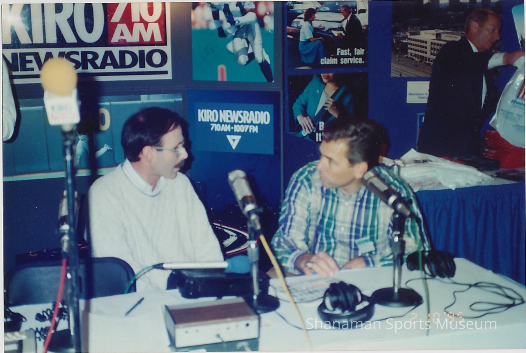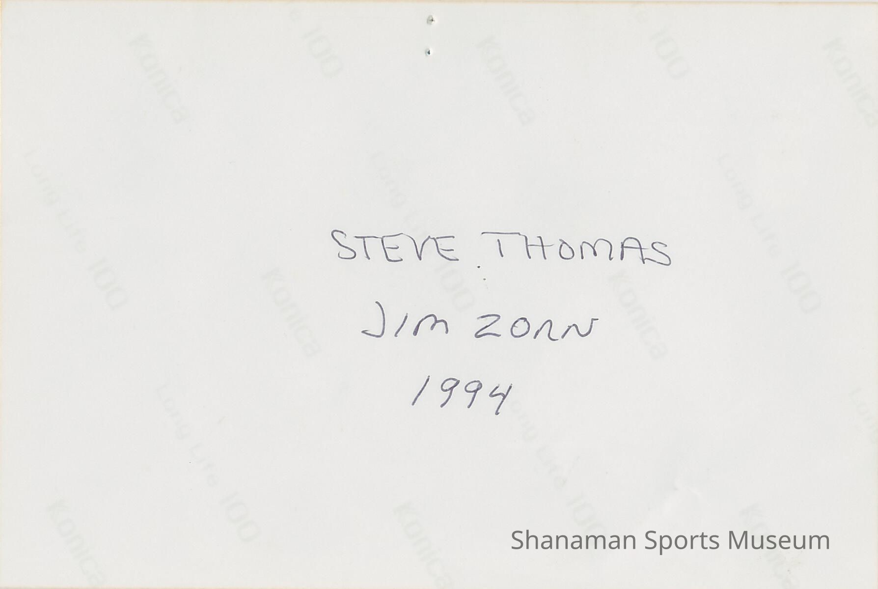 Color photo of two men at table with microphones (written on back "Steve Thomas Jim Zorn 1994")