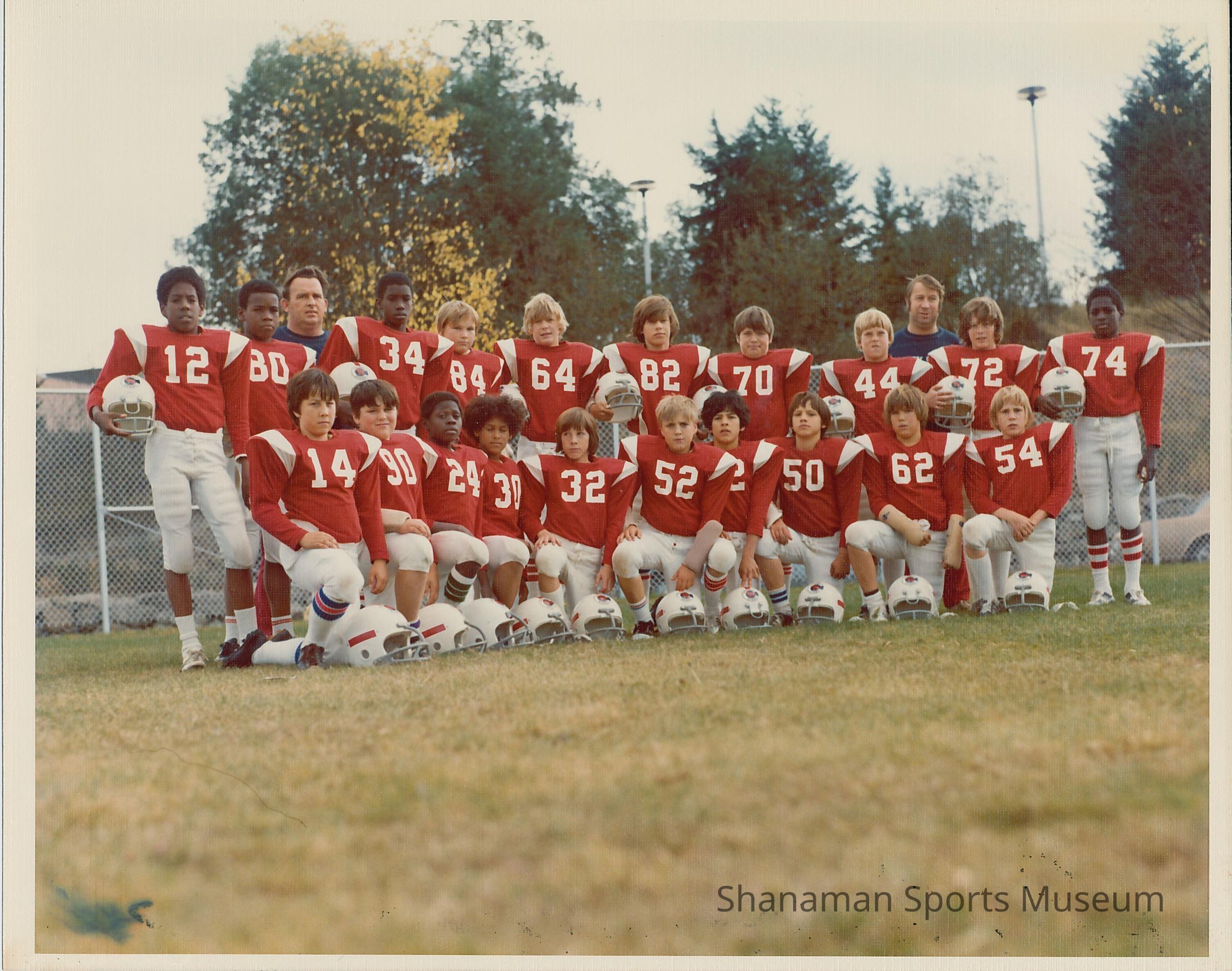 Photo of youth footbal team; written on back of photo "1973 Pewee Football (Chick Ruth - coach)"
