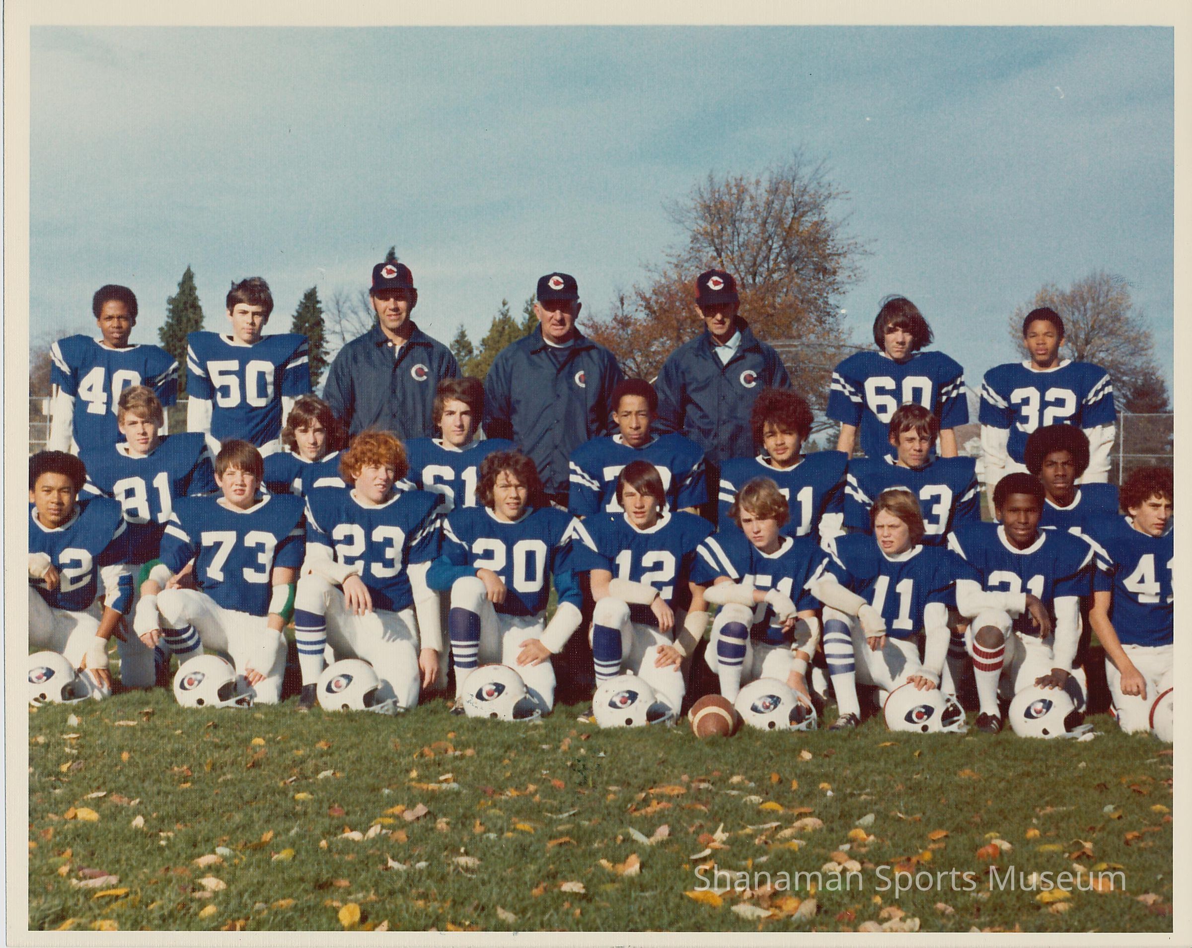 Photo of youth footbal team; written on back of photo "1973 Cheney Studs 13+Under - Norm Orr Coach"