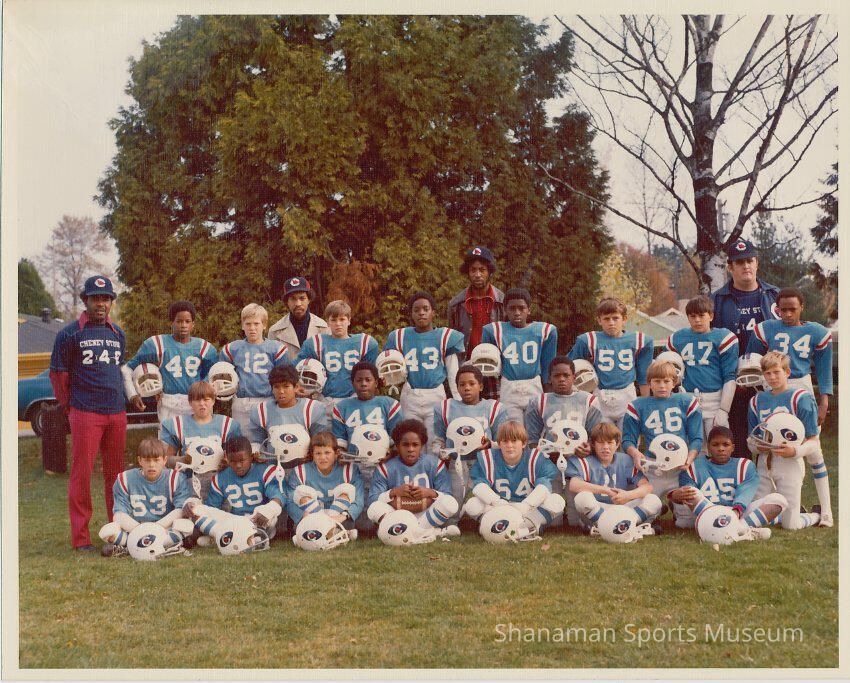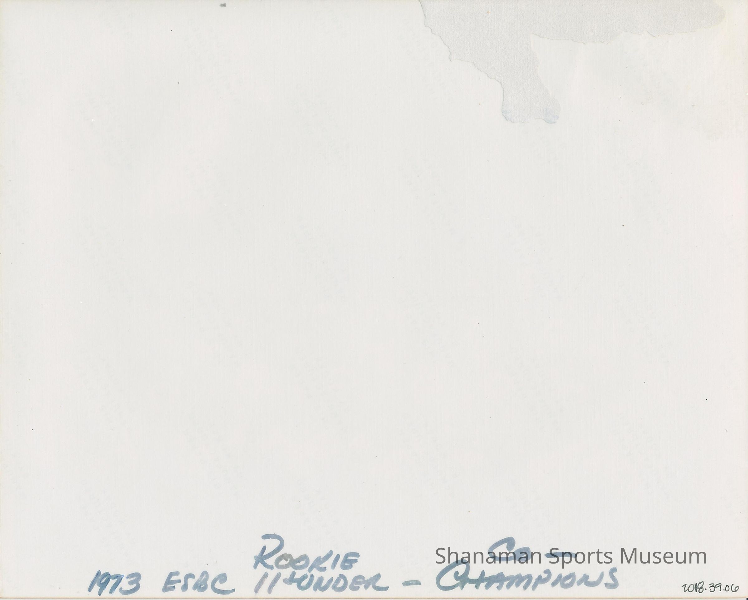 Photo of youth footbal team; written on back of photo "1973 ESBC Rookie 11+Under - Co-Champions"