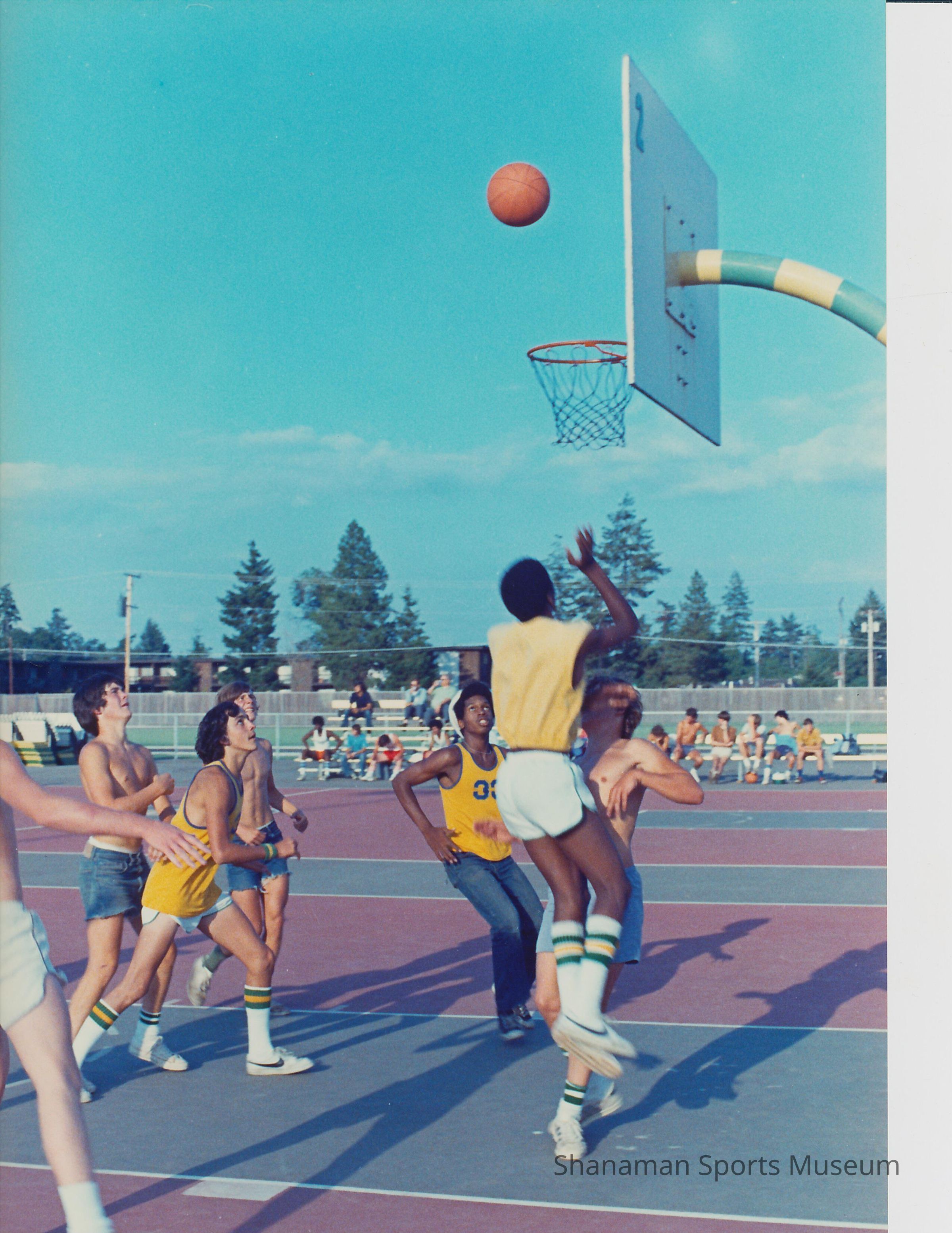 Color photo of men playing basketball at an outdoor court (men mostly wearing yellow shirts)