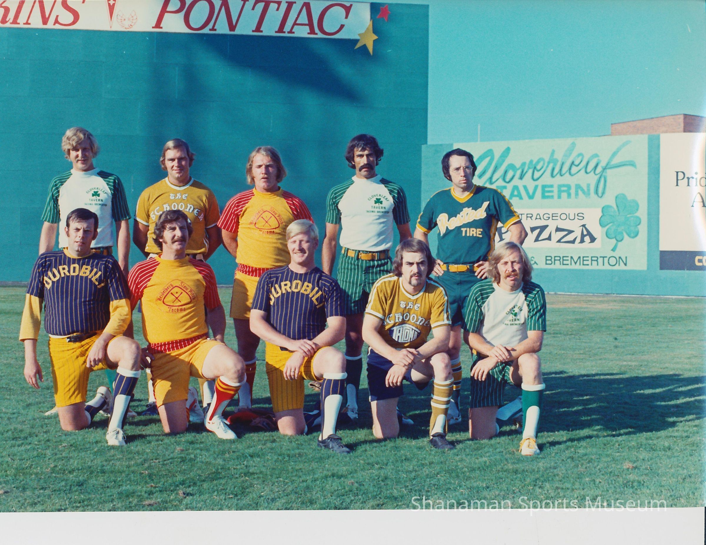Color photo of Western Washington Slowpitch League All-Star Team. Front Row L-R: Art McLarney, Marco Malich, Gary Fultz, Ken DeForrest, Ed Burmester; Back Row L-R: Doug Armstrong, Ed McGrath, Butch Pasquale, Dave Benedict, Gordy Pfeifer