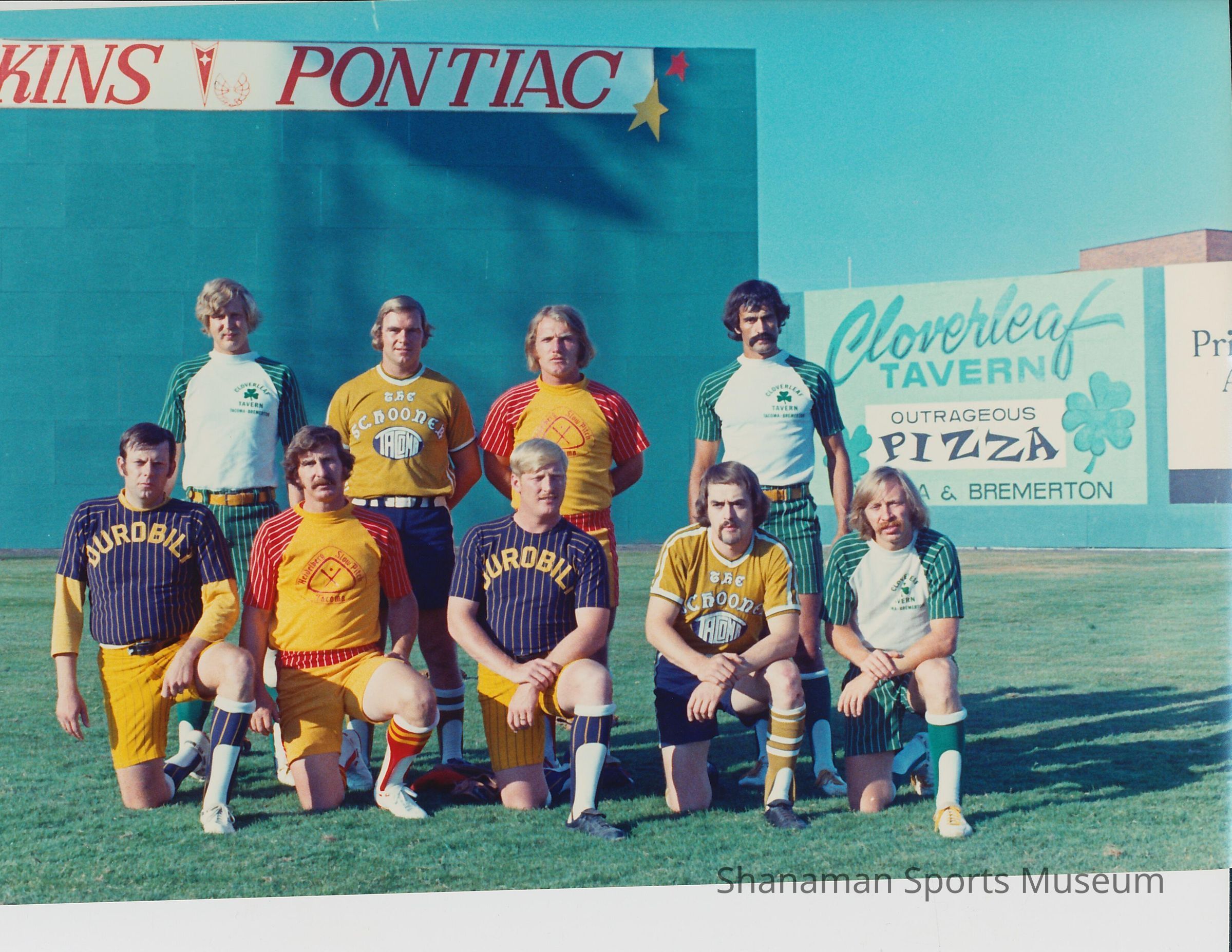 Color photo of Western Washington Slowpitch League All-Star Team. Front Row L-R: Art McLarney, Marco Malich, Gary Fultz, Ken DeForrest, Ed Burmester; Back Row L-R: Doug Armstrong, Ed McGrath, Butch Pasquale, Dave Benedict, Gordy Pfeifer