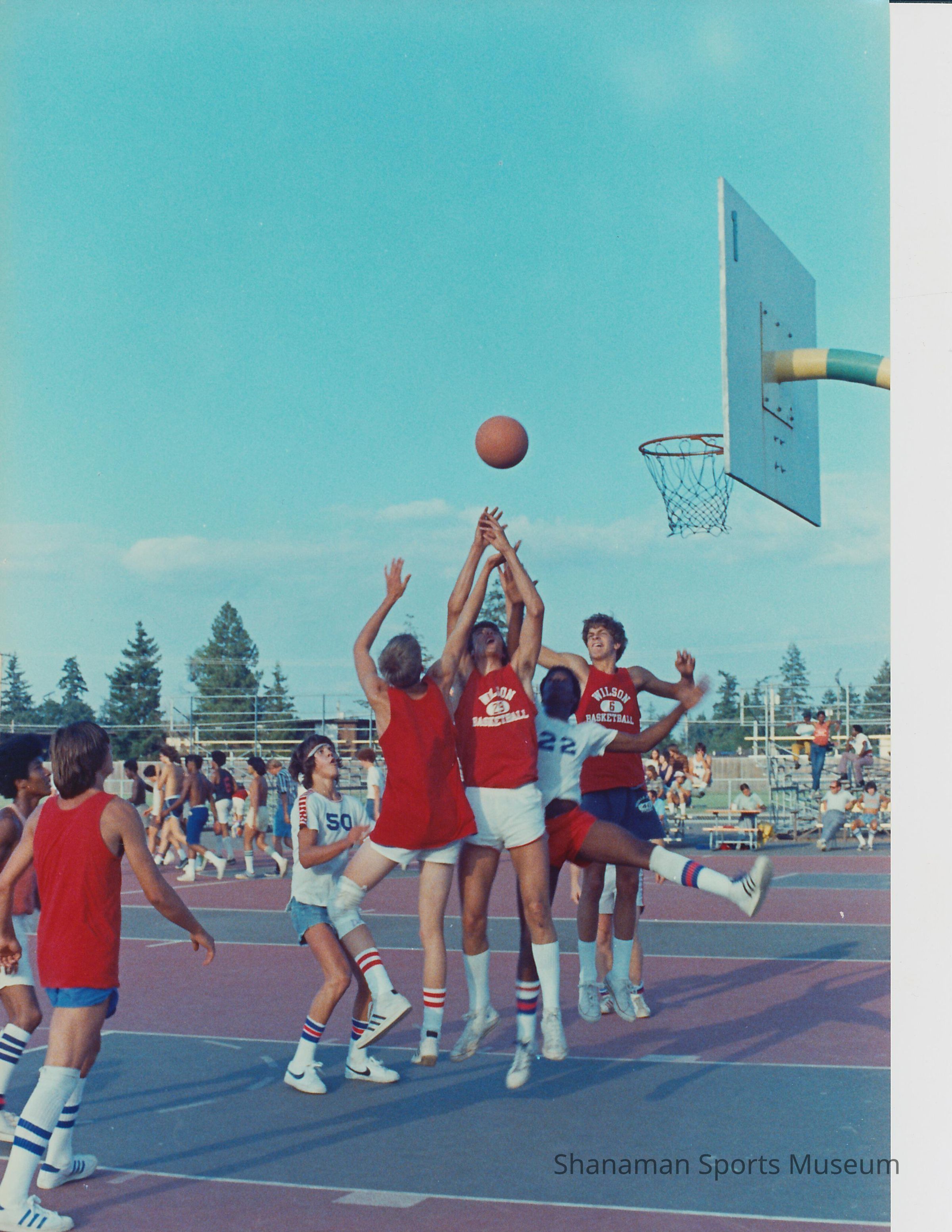 Color photo of men playing basketball at an outdoor court (men mostly wearing red shirts)
