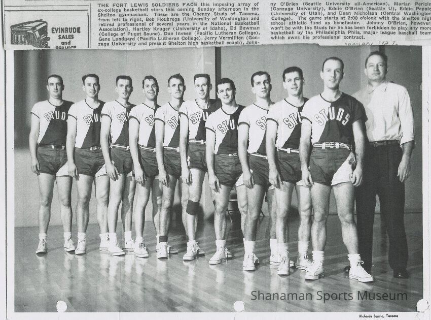 B&W newspaper clipping, team photo of Cheney Studs Basketball Team