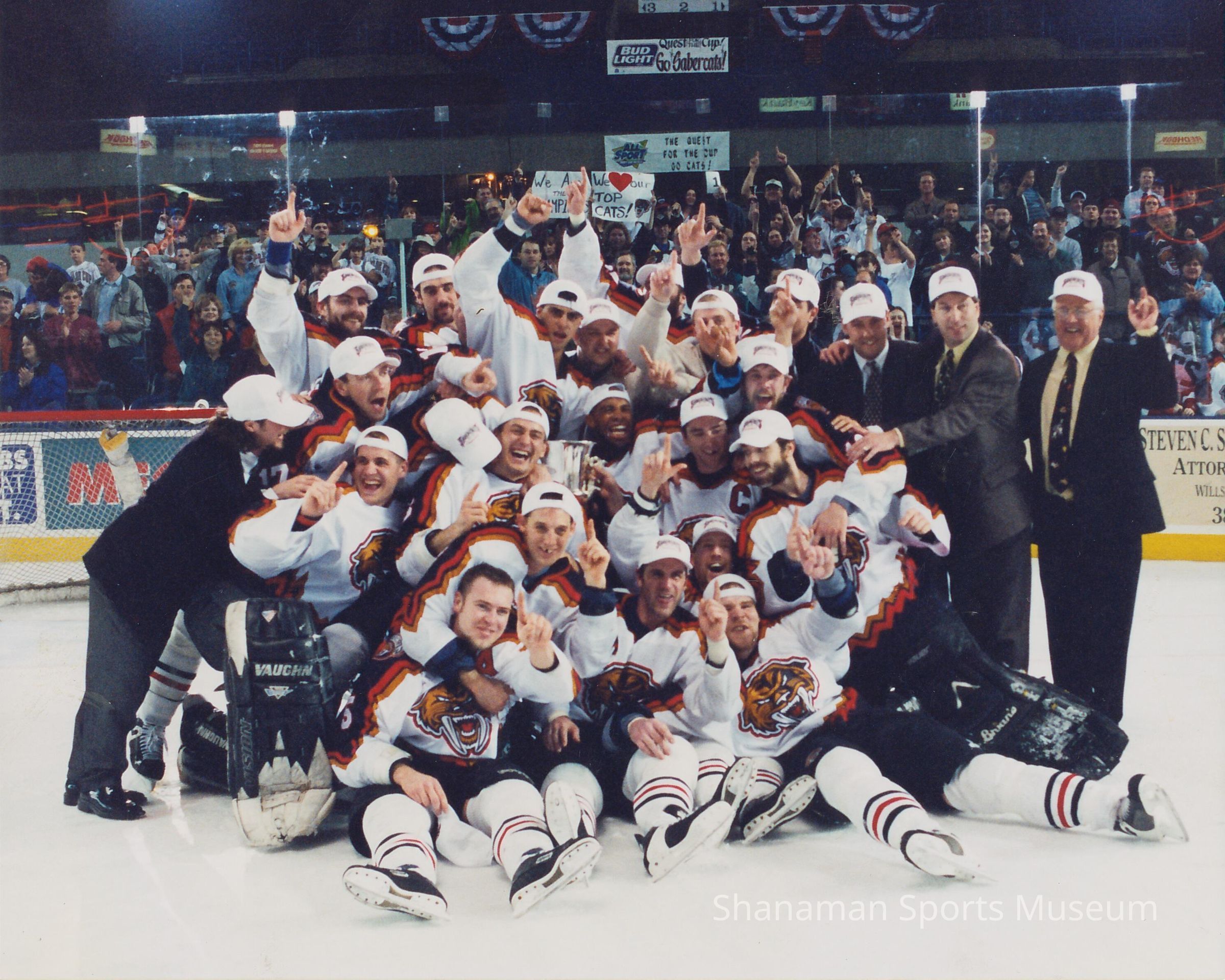 Candid photo of Tacoma Sabercats team sitting on the ice celebrating