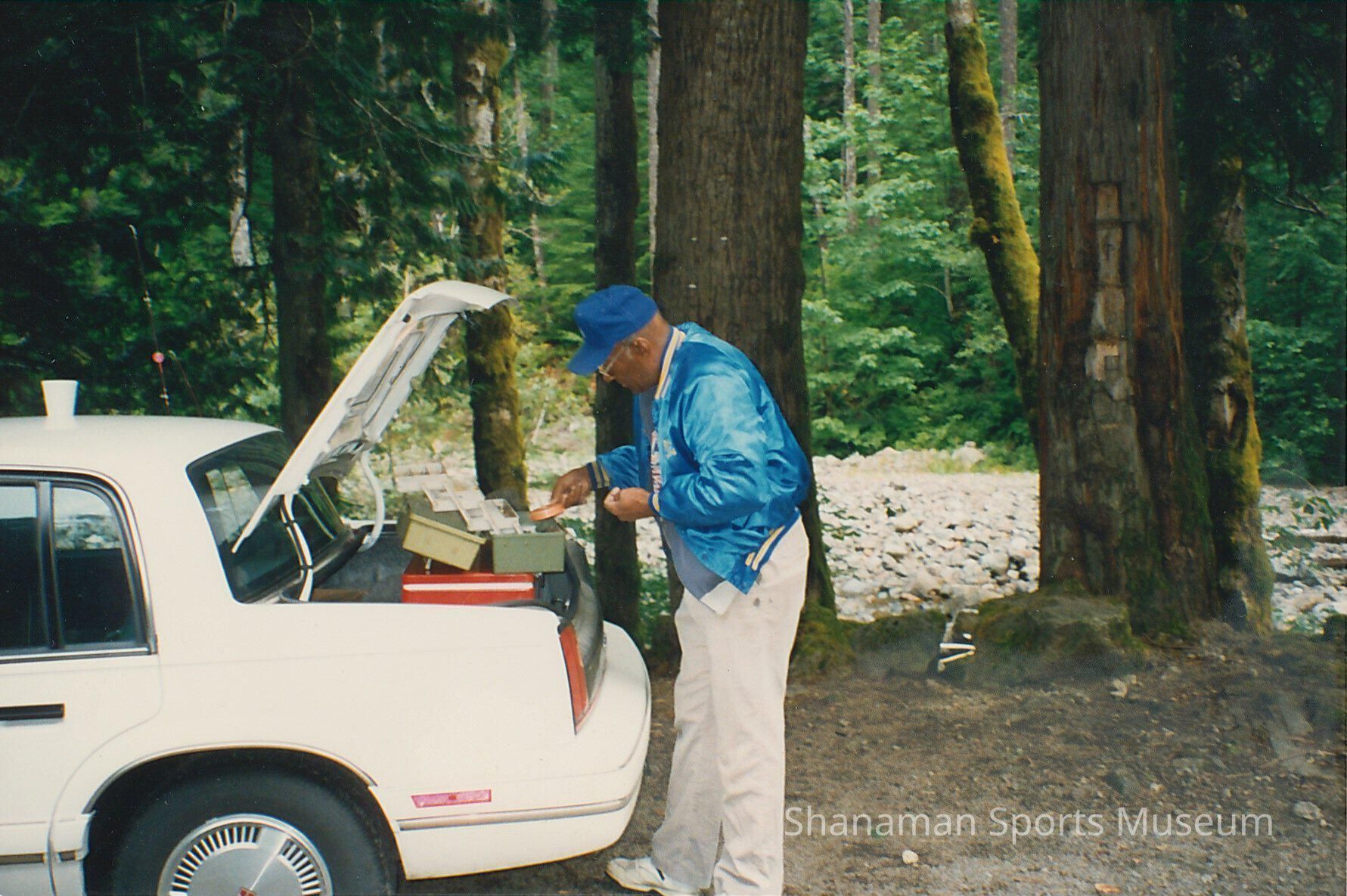Man gathering items from trunk of car