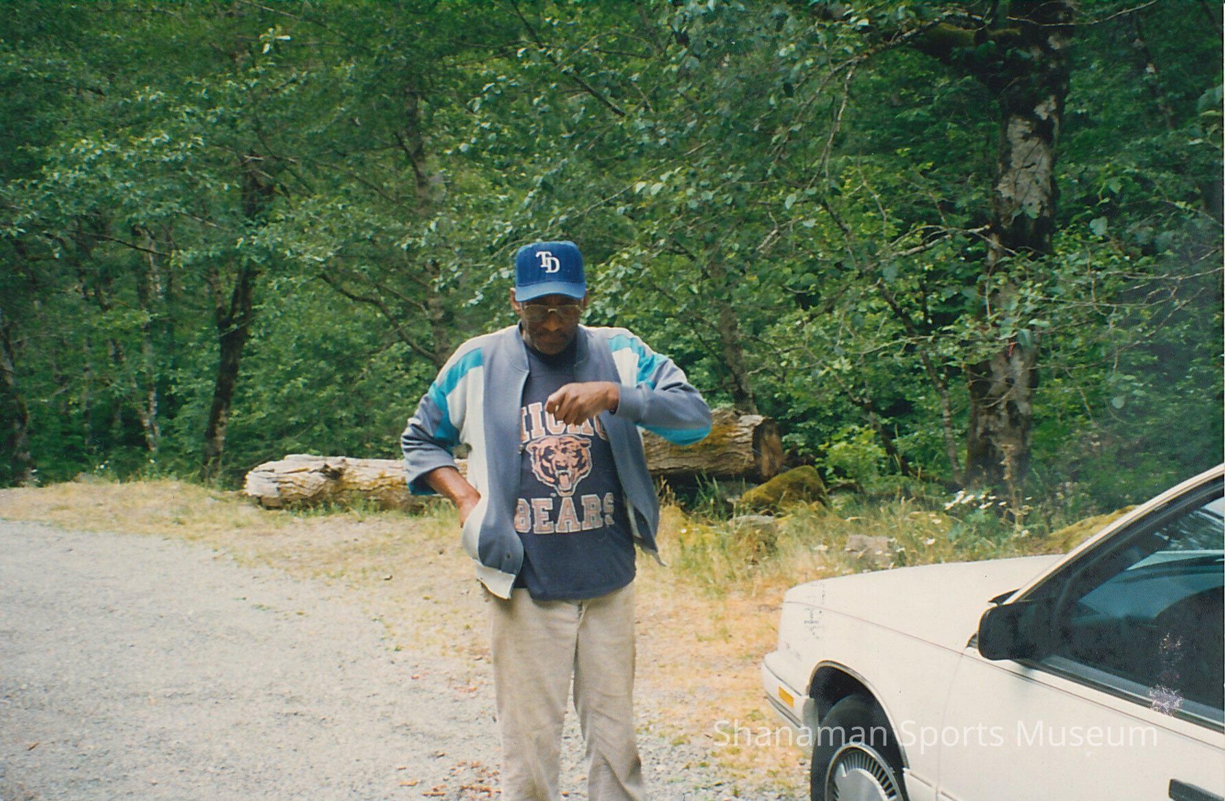 Photo of man in UCLA bears tshirt and blue jacket standing beside white car