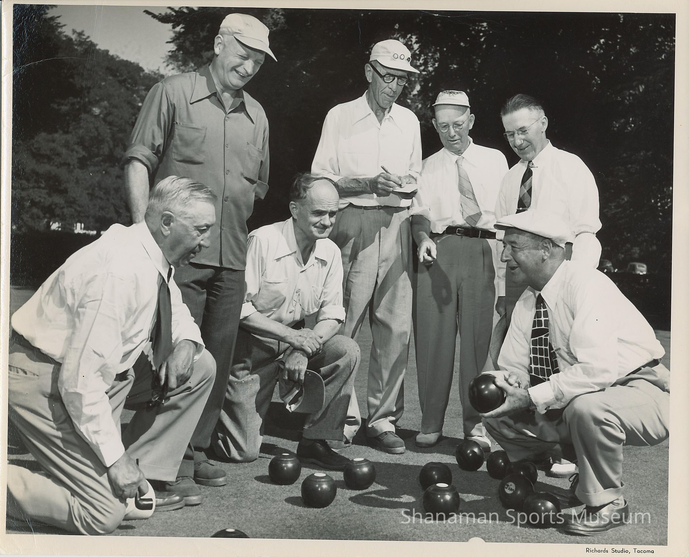 Tacoma lawn bowlers get points from the President of the American Lawn Bowling Association, Bill Hay (right), on his visit on September 7, 1950. The green in Wright Park opened in 1936.