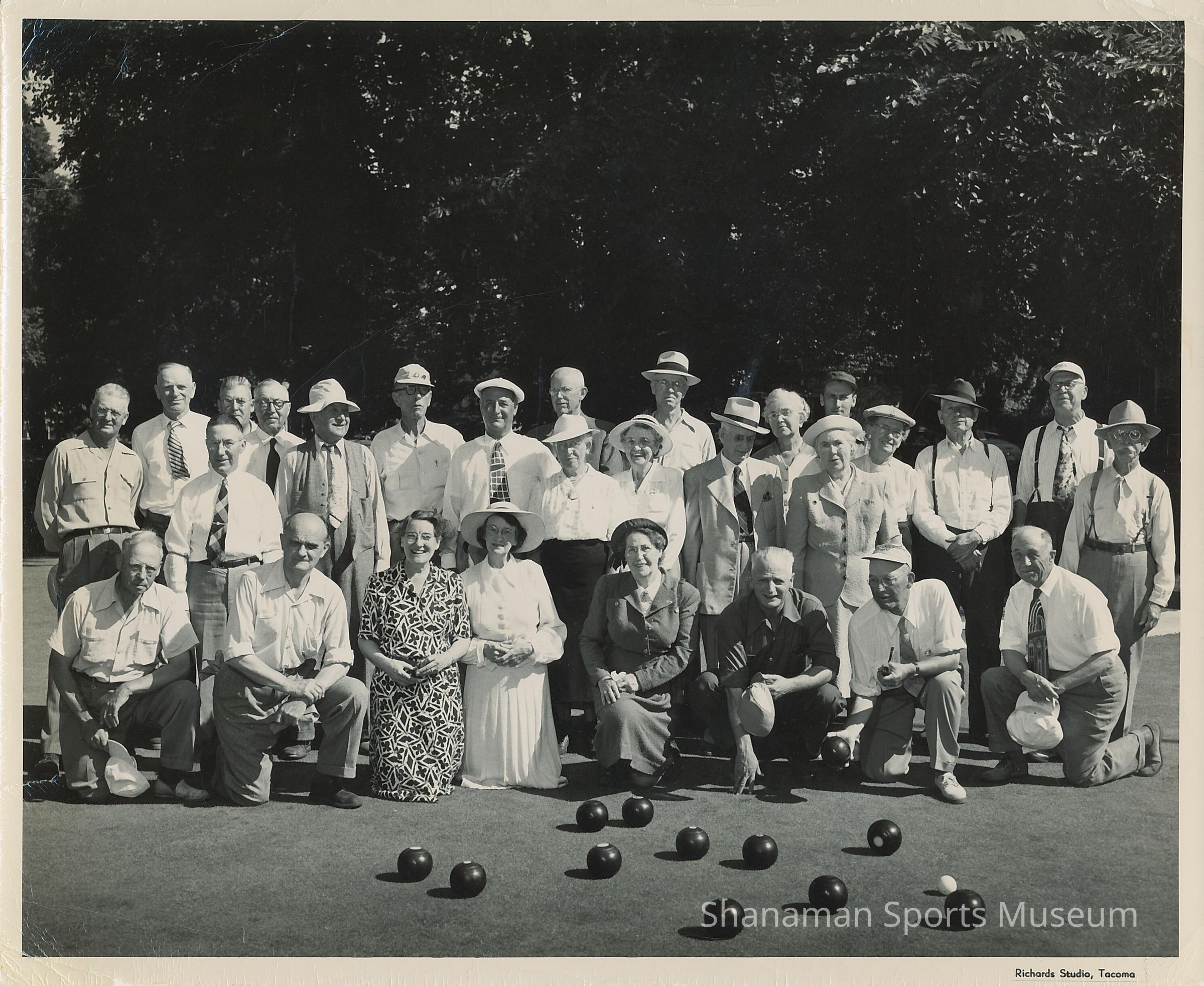 Photo of men and women at Wright Park Green during visit of the President of the American Lawn Bowling Association, Bill Hay (center, with patterned tie and white hat), on his visit on September 7, 1950. The green in Wright Park opened in 1936.