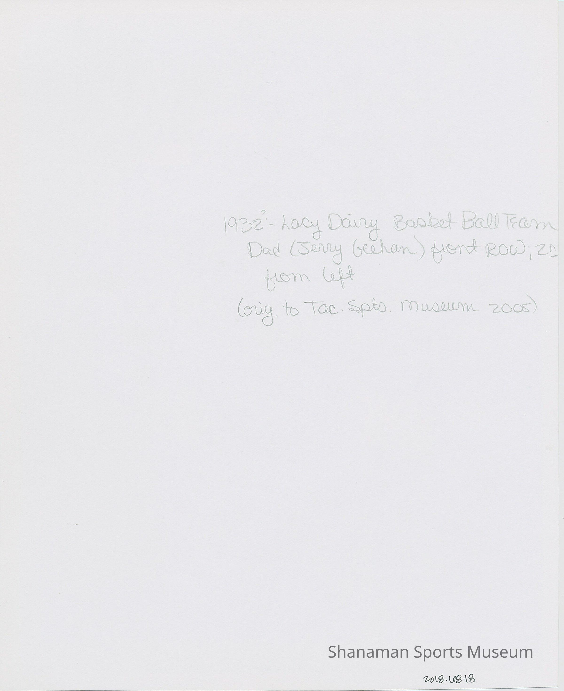 1932 Lacy Dairy Basketball Team; Jerry Geehan (front row, 2nd from left)