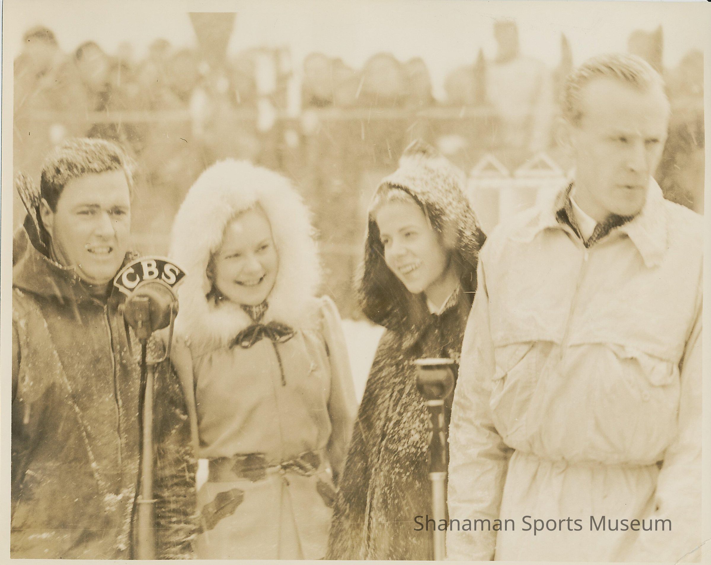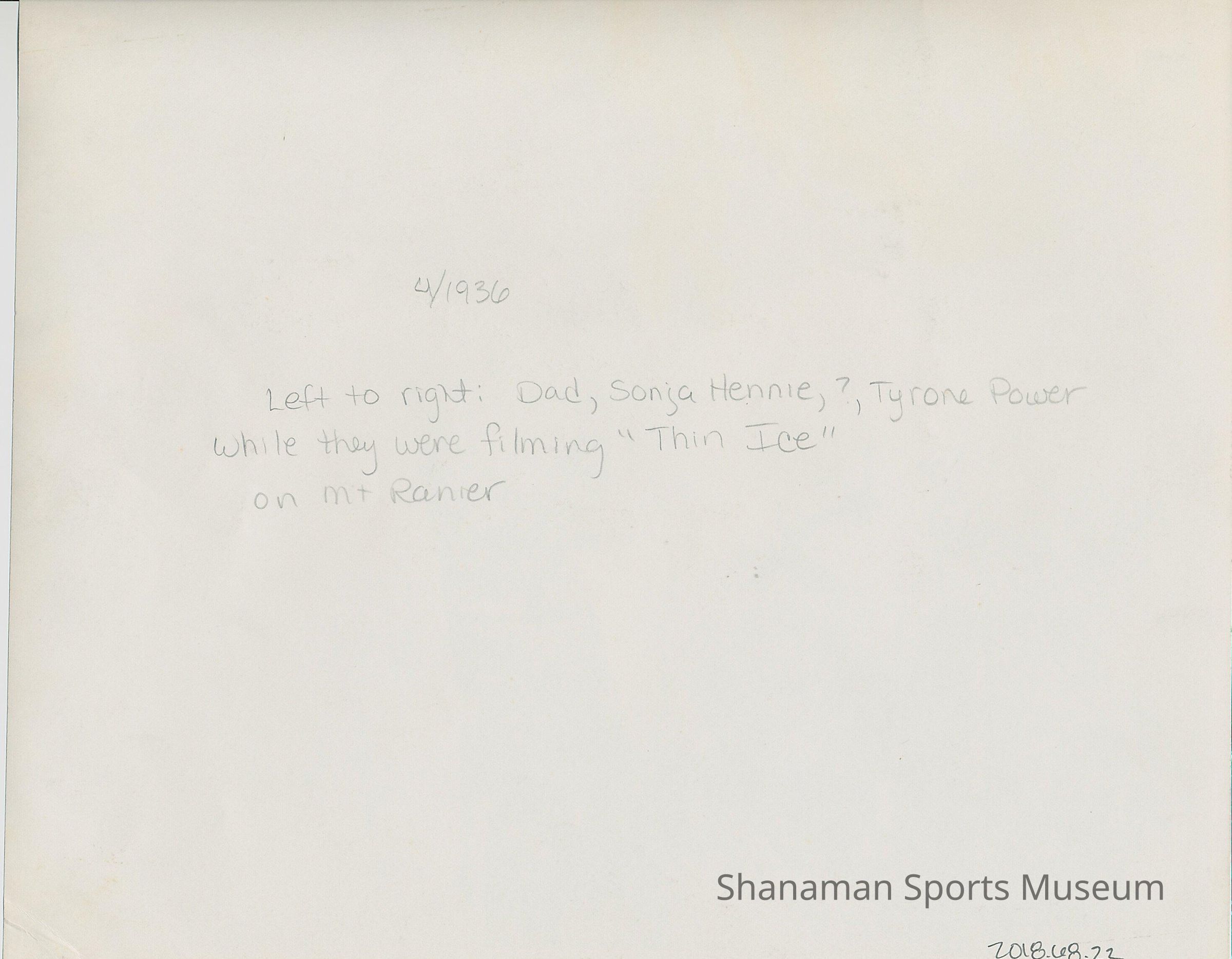 Jerry Geehan, Sonja Hennie, (?), Tyrone Power during filming of "Thin Ice" on Mt. Rainier