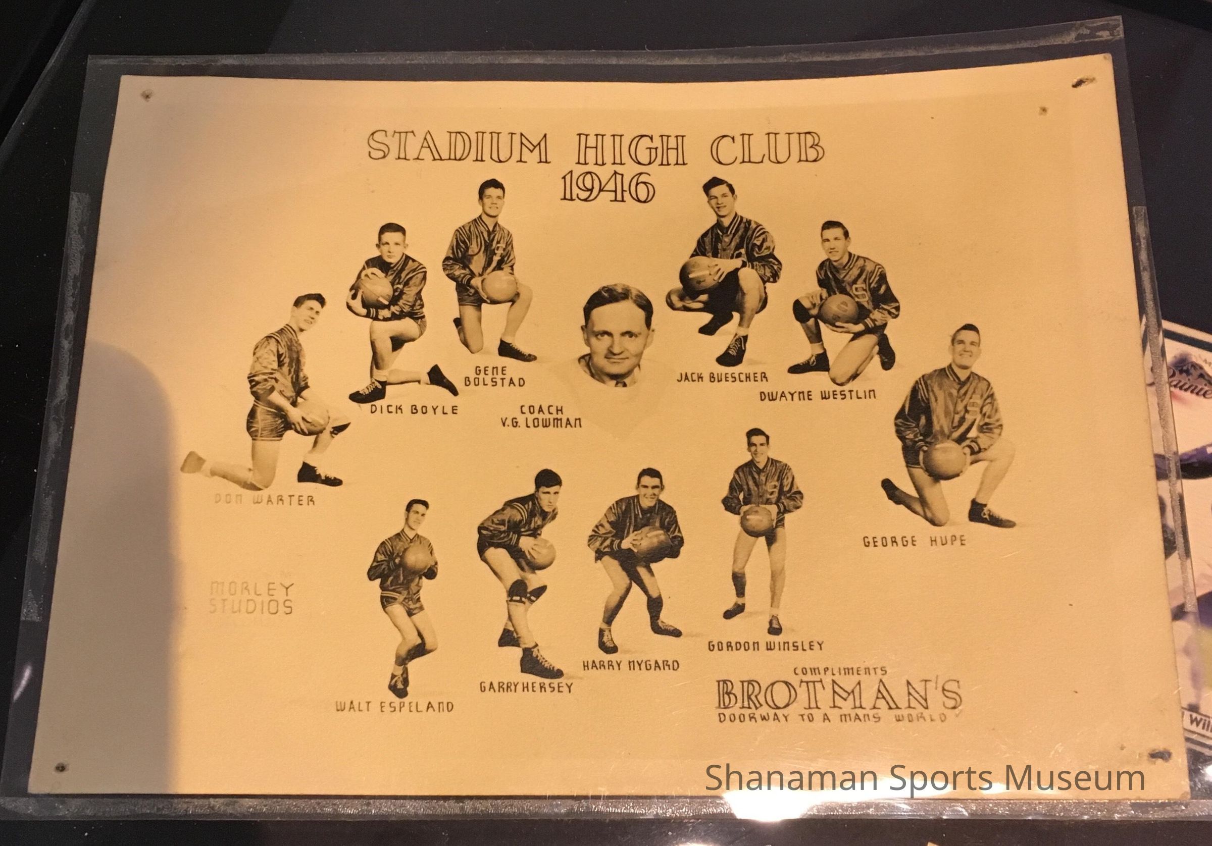 Photo of ten basketball players and their coach. Stadium High Club 1946 "Compliments of Brotman's Doorway to a Mans World" Found during move January 2019