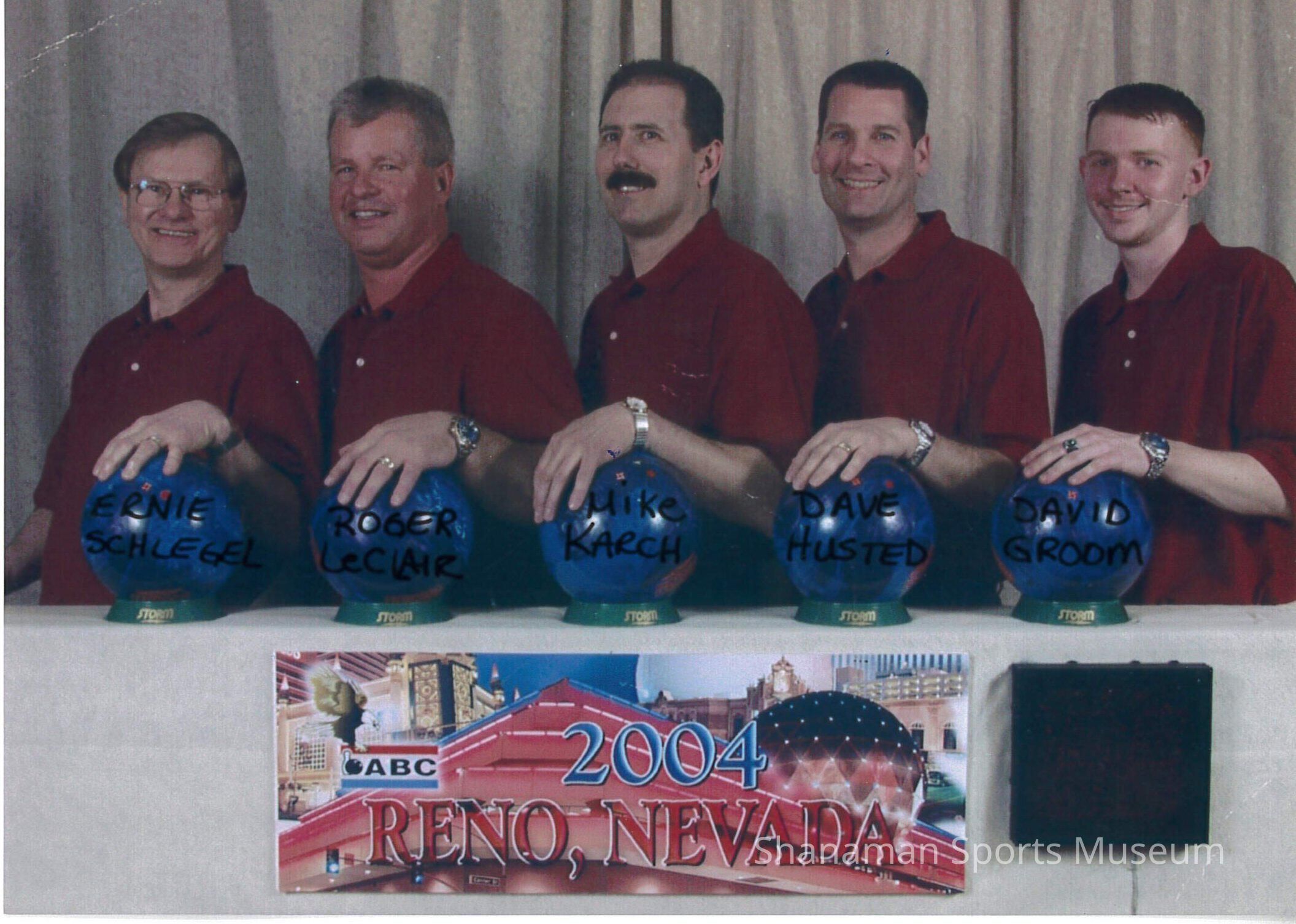 Photograph- color, bowling team, 2004 ABC Tournament in Reno. L-R: Ernie Schlegel, Roger LeClair, Mike Karch, Dave Husted and David Groom.