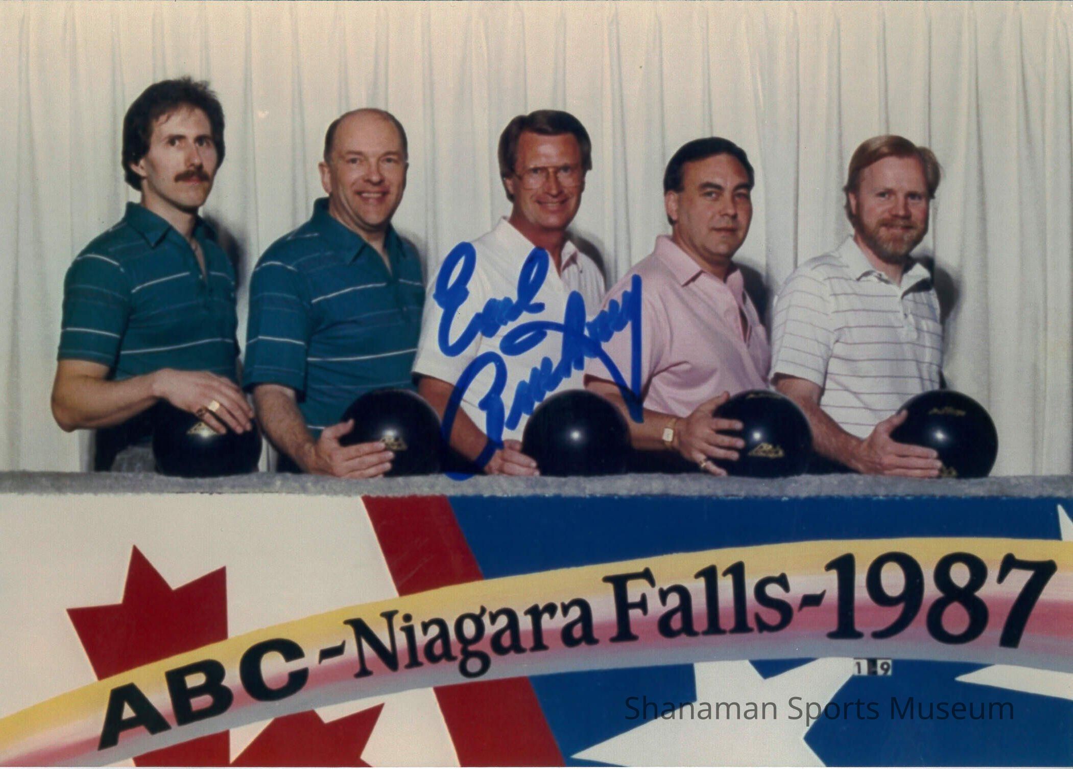 Photograph- color, bowling team, 1987 ABC Tournament in Niagra Falls. L-R: Mike Karch, Dave Tuell, Jr., Earl Anthony, Gary Mage and Bob Bjorke.
