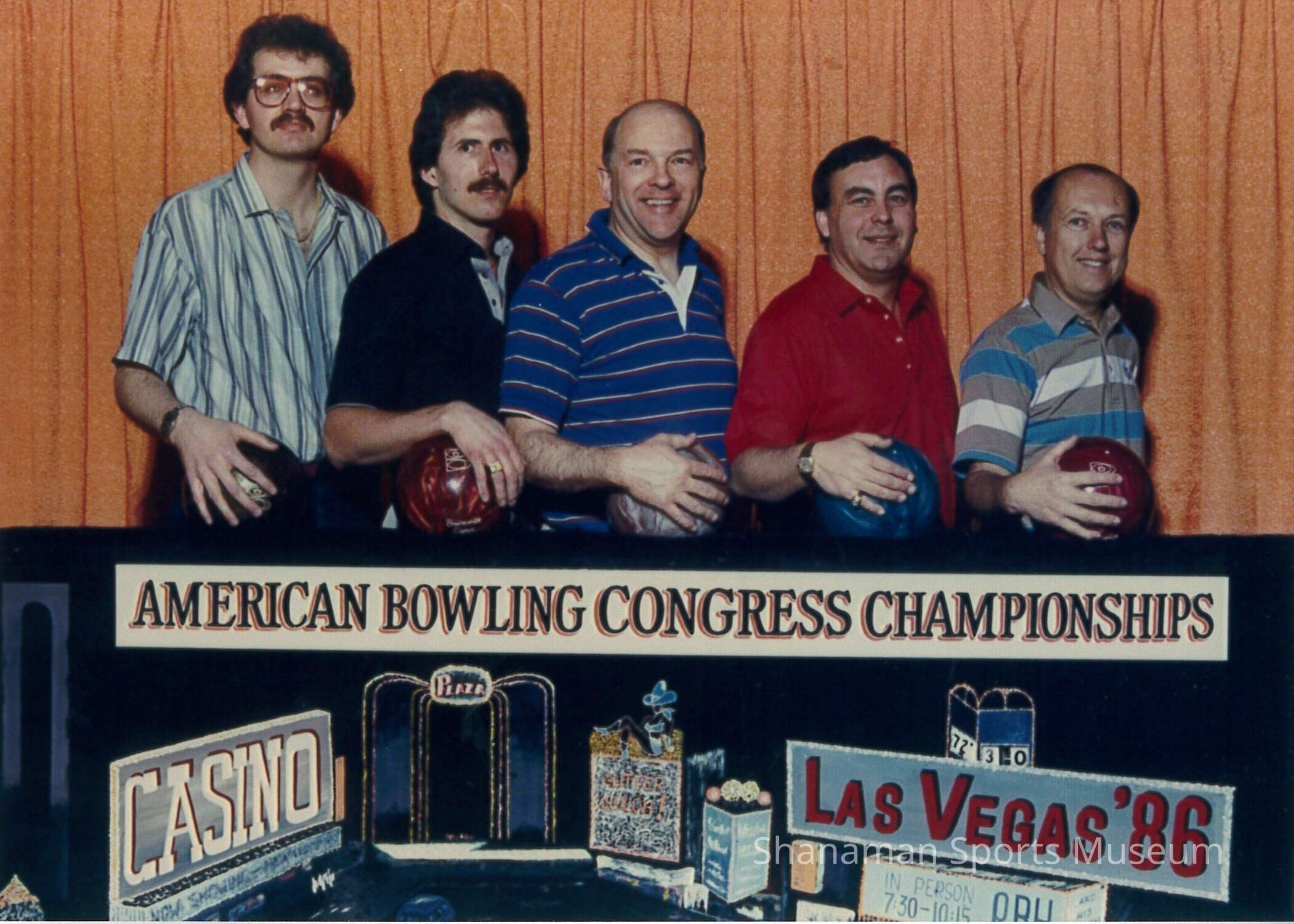 Photograph- color, bowling team,1986 ABC Tournament in Las Vegas. L-R: Layton Shirley, Mike Karch, Dave Tuell, Jr., Gary Mage and Ed Hanson.