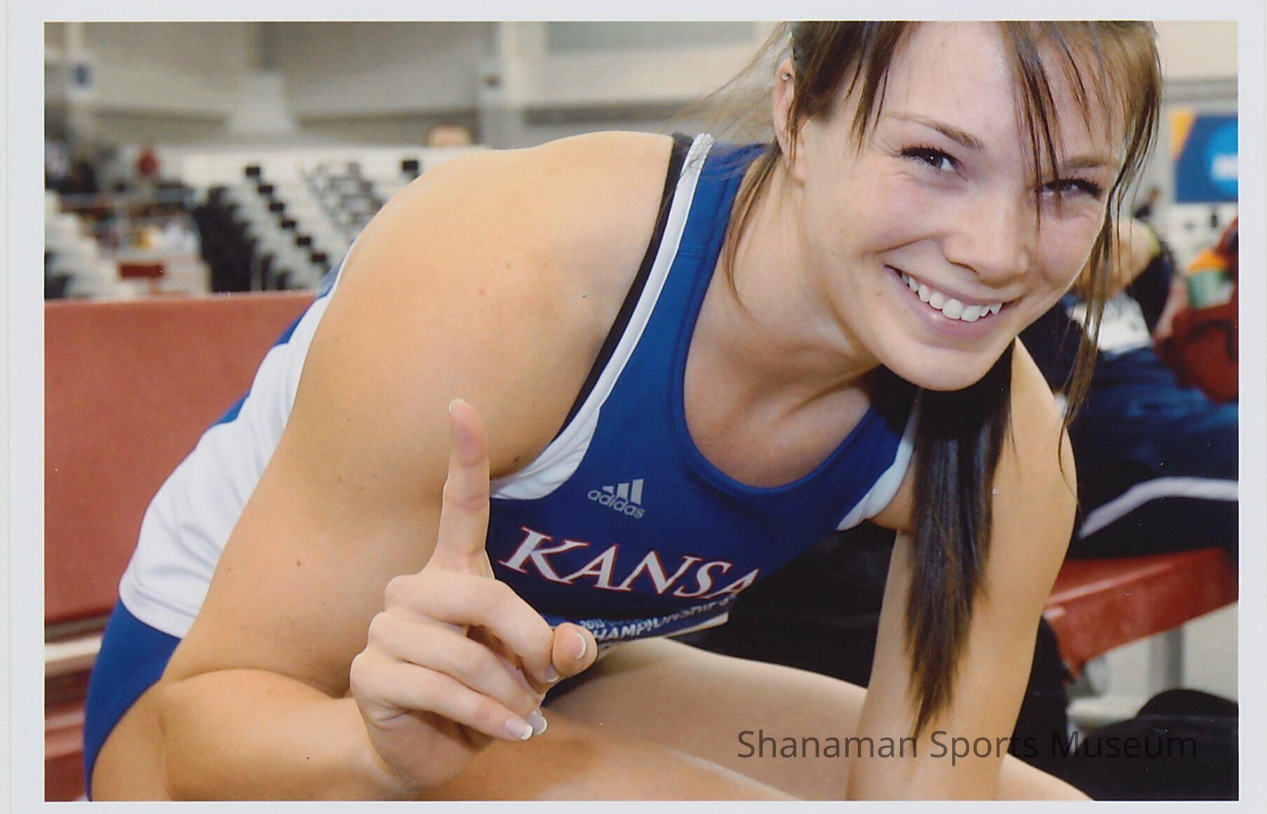 Photo of Andrea Geubelle, a standout track and field star at Curtis High School who competed for the University of Kansas and qualified for the U.S. Olympic team and participated at the 2016 Olympics in Rio. Geubelle, the daughter of Dawn DeCius and Jeff Geubelle, is a three-time NCAA Champion, finished the 2013 season ranked as the No. 1 female American triple jumper and placed 21st at the Olympic Games in 2016. She also earned a bronze medal at the 2016 USA Indoor Championships in the long jump, a silver in the 2014 USA Indoor Championships in the triple jump and a bronze in the long jump, and a gold at the 2013 USA Indoor Championship in the triple jump. At Curtis High, Geubelle won the 100m dash, the long jump and the triple jump her senior season.