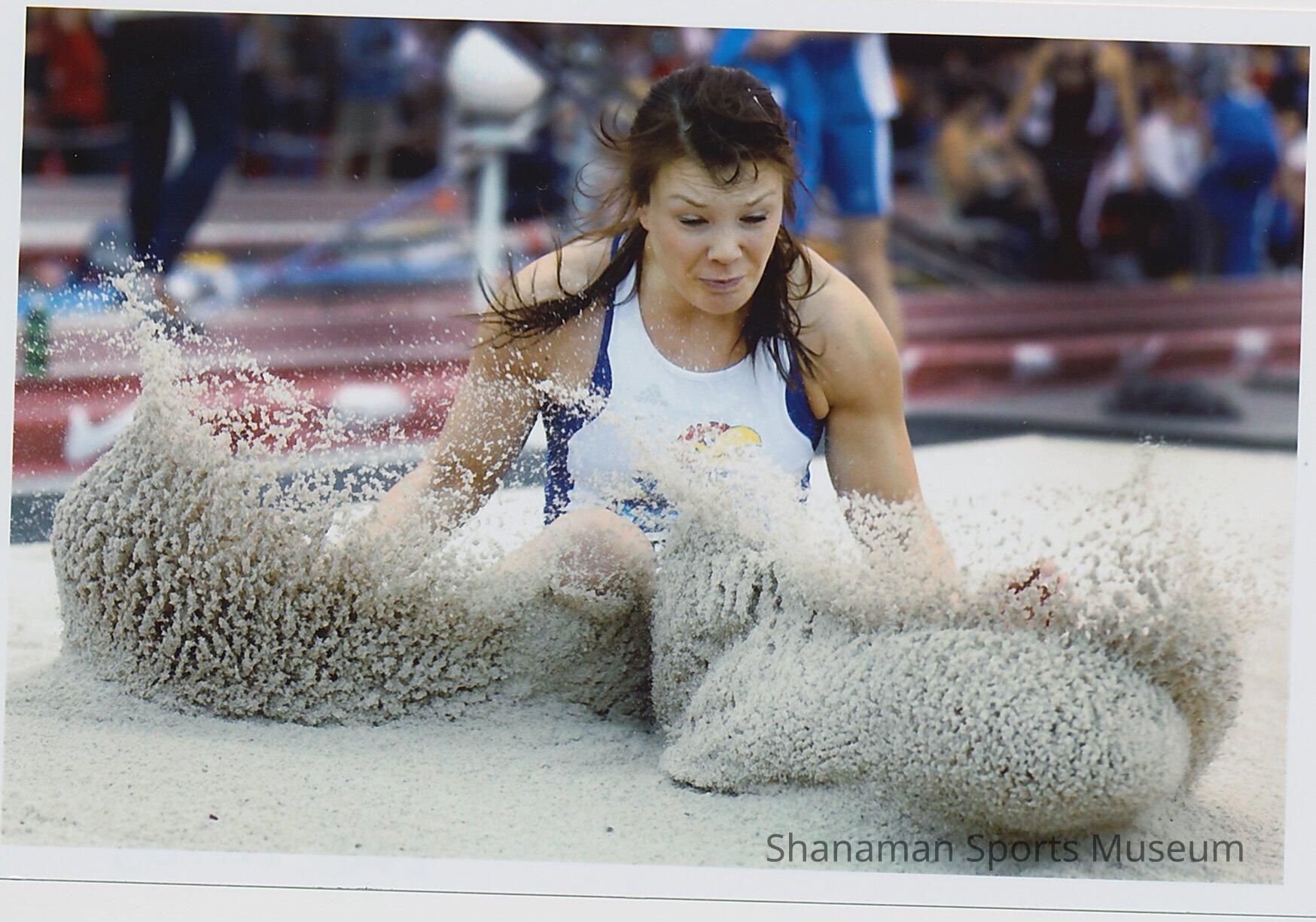 Photo of Andrea Geubelle, a standout track and field star at Curtis High School who competed for the University of Kansas and qualified for the U.S. Olympic team and participated at the 2016 Olympics in Rio. Geubelle, the daughter of Dawn DeCius and Jeff Geubelle, is a three-time NCAA Champion, finished the 2013 season ranked as the No. 1 female American triple jumper and placed 21st at the Olympic Games in 2016. She also earned a bronze medal at the 2016 USA Indoor Championships in the long jump, a silver in the 2014 USA Indoor Championships in the triple jump and a bronze in the long jump, and a gold at the 2013 USA Indoor Championship in the triple jump. At Curtis High, Geubelle won the 100m dash, the long jump and the triple jump her senior season.