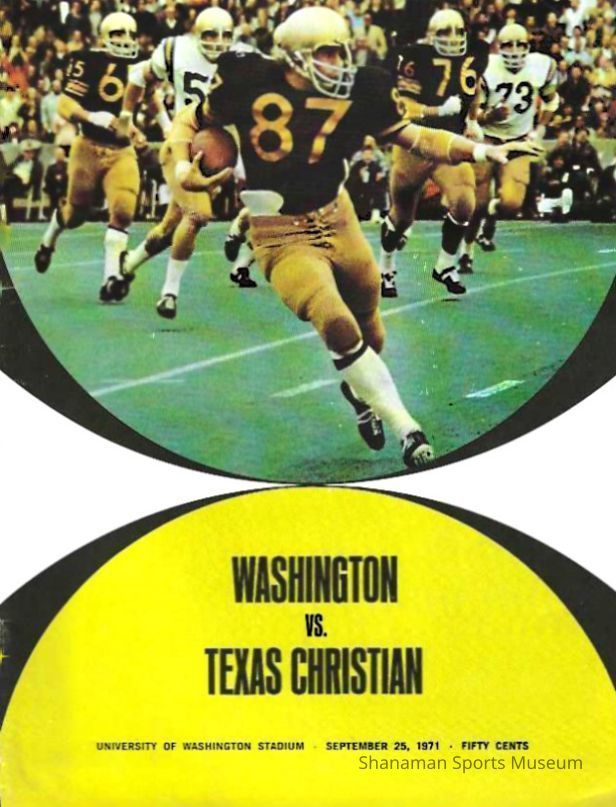 A football program from the University of Washington (UW) vs Texas Christian University (TCU), September 15, 1971. At the University of Washington Stadium. From the Husky Sideliner (official UW football magazine).Lexicon