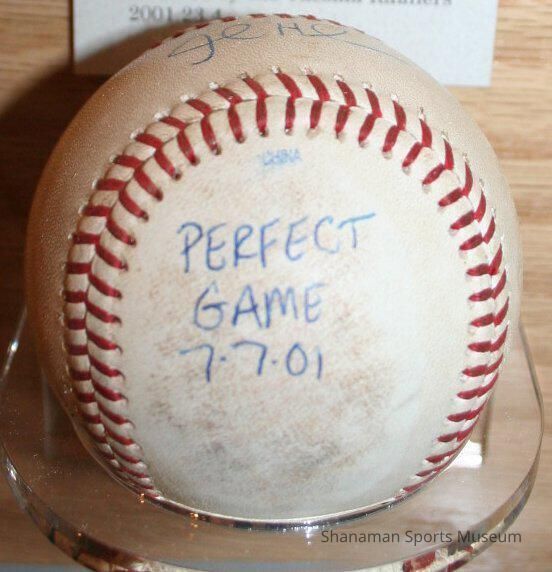 Rawlings Official Baseball for the Pacific Coast League game ball used during John Halama’s perfect game on July 7, 2001. The ball is signed in blue ink “JH HL PERFECT GAME 7-7-01.” Halama appeared in only three games for Tacoma in 2001, spending most of the year with the Mariners, as he won 10 games and helped the team win the American League West title and tie an MLB record with 116 wins. He was sent down to Tacoma midway through the season, and in his second start he retired all 27 batters for the first nine-inning perfect game in Pacific Coast League history. He struck out nine batters and threw 97 total pitches in the 6-0 win over Calgary at Cheney Stadium. Quoted in the game story for The News Tribune, Halama said, “I was just trying to stay within myself. I was sent down here for a specific reason, to get my mechanics back and to get the ball down.” Halama came to the Mariners from the Houston Astros following the 1998 season as the “player to be named later” in the Randy Johnson trade. He totaled 56 wins over nine years with seven MLB teams. Forty-one of those wins came during his four-year stint (1999-2002) with the Mariners.