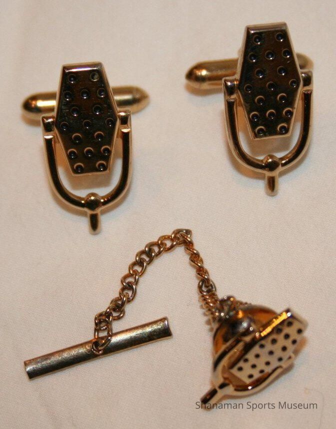 Famous broadcaster Jerry Geehan wore these cufflinks and small tie pin-gold microphone set. In 1937, Geehan became the first radio play-by-play announcer of the Tacoma Tigers. Geehan, who graduated from Lincoln High School in 1930, in considered to be the dean of radio sports broadcasting in the Tacoma area. Geehan was the president of the Tacoma Athletic Commission in 1947. Geehan became the general manager of Channel 13 TV in 1952 and was the general manager of KTAC Radio from 1952 to 1969. He also served as the chairman of the board of the Washington State Association of Broadcasters. Many of Tacoma's great sportscasters got their start under Geehan, including Clay Huntington, Rod Belcher, Dough McArthur, Bob Robertson, Don Hill, Art Popham and Bill O'Meara.Lexicon
