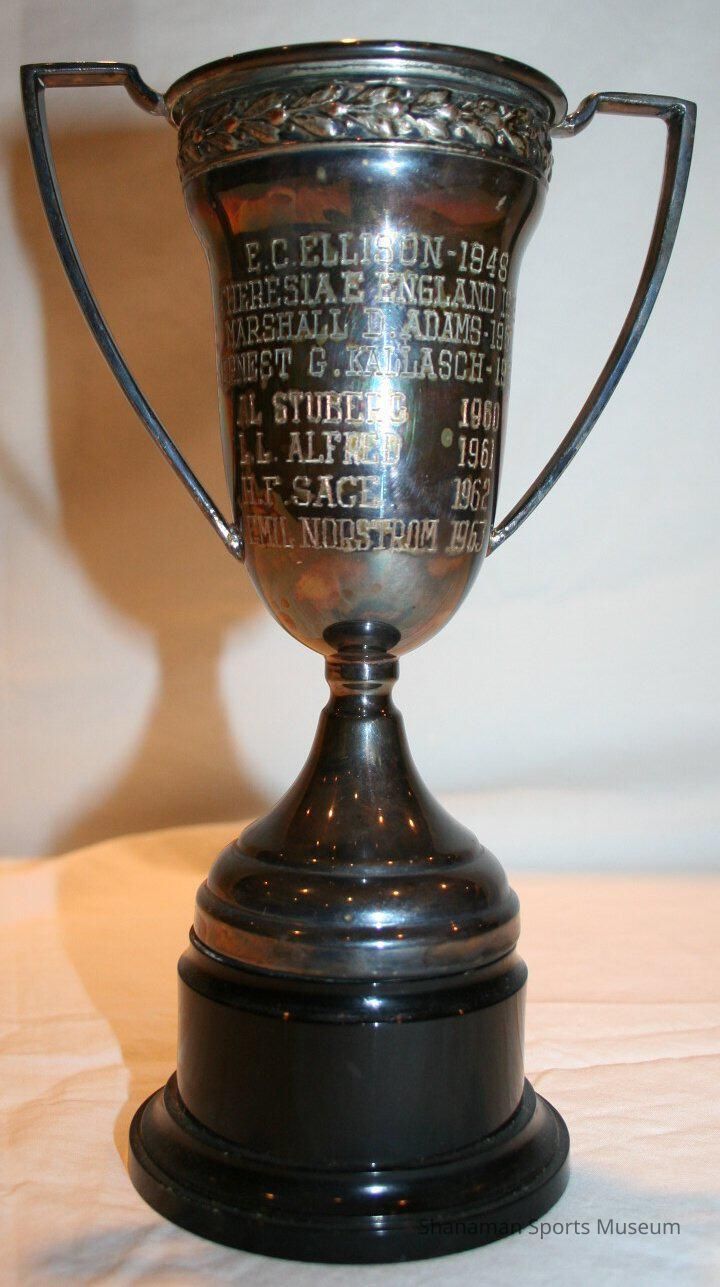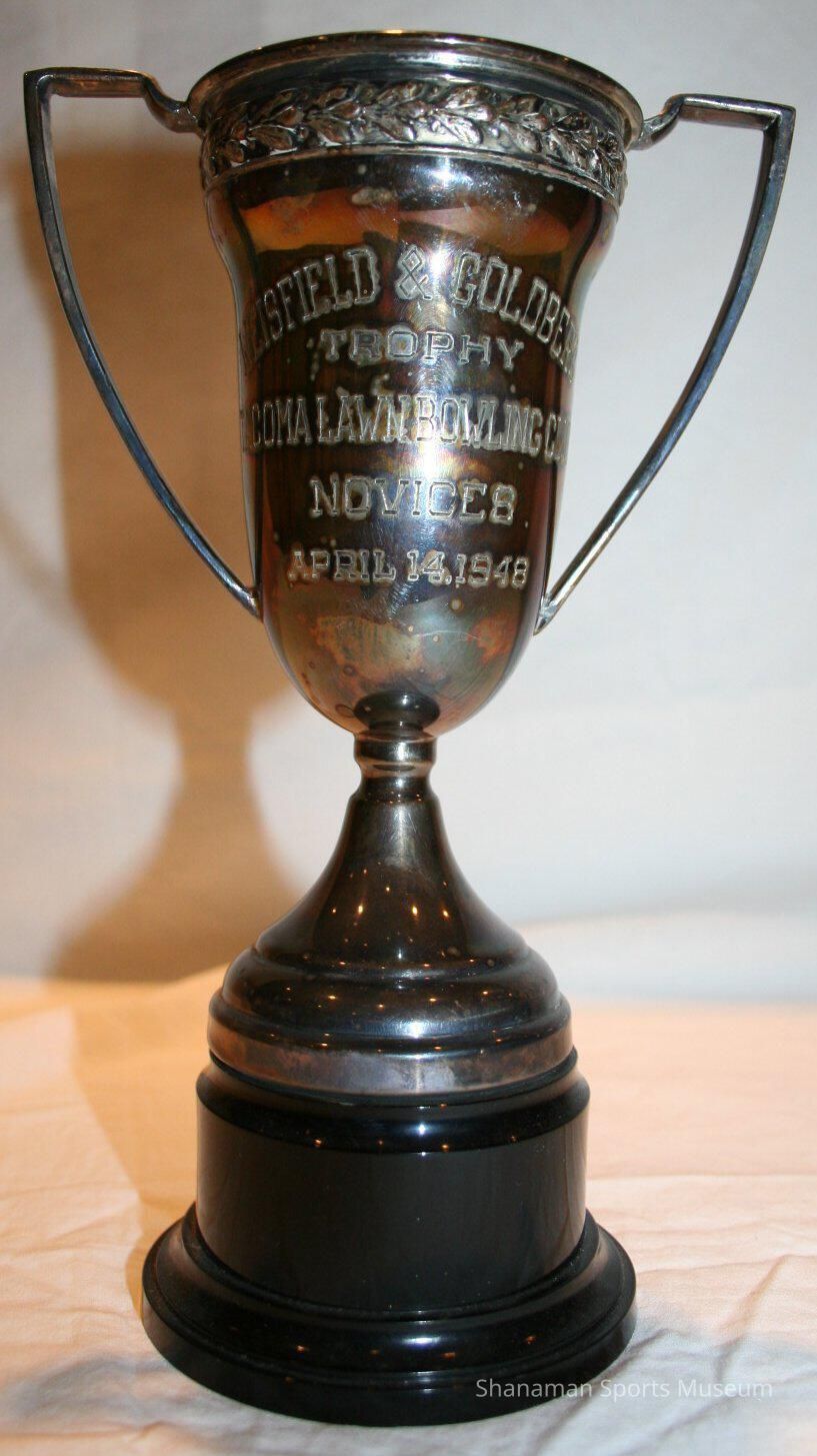 Trophy- lawn bowling, Weisfield & Goldberg Trophy, Tacoma Lawn Bowling Club, Novices, April 14, 1948. Winners from 1948-1963 listed on the back of trohpy. Metal on black plastic base, 8.5" high.Lexicon